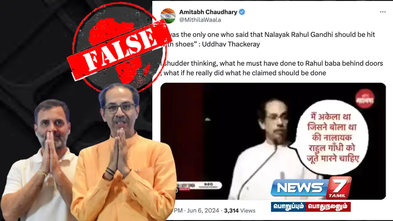 இதே பதிவை, ட்விட்டர் (எக்ஸ்) இல் மற்றொரு பயனர், “ராகுல் காந்தியை செருப்பால் அடிக்க வேண்டும் என்று நான் சொன்னேன்: உத்தவ் தாக்கரே.. கதவுகளுக்குப் பின்னால் ராகுலை அவர் என்ன செய்திருப்பார் என்று நினைத்து நான் நடுங்குகிறேன். அவர் செய்ய வேண்டியதை அவர் உண்மையில் செய்தார்” என பகிர்ந்திருந்தார்.