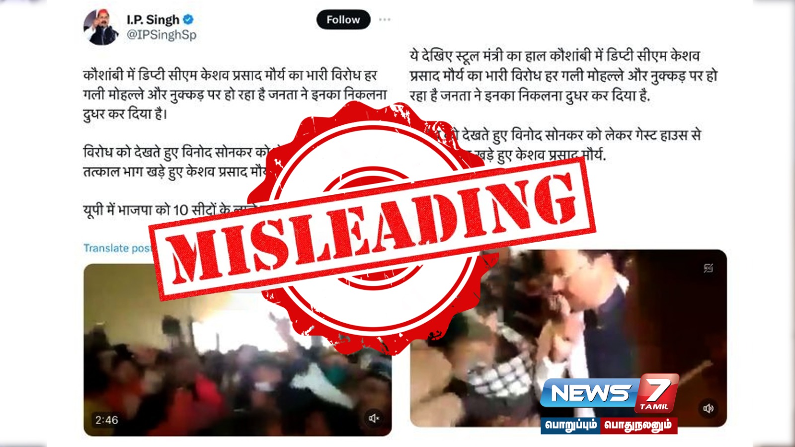உத்தர பிரதேச மாநில எதிர்க்கட்சியான சமாஜ்வாதி கட்சியின் செய்தித் தொடர்பாளர் ஐபி. சிங் தனது எக்ஸ் தள பக்கத்தில் இந்த வீடியோவை பகிர்ந்து ” மக்களின் எதிர்ப்பைக் சமாளிக்க முடியாமல் கேசவ் பிரசாத் மௌரியா வினோத் சோங்கருடன் தப்பி ஓடிவிட்டார். உ.பி.யில் 10 இடங்களுக்கு கூட பா.ஜ.க போராட வேண்டியுள்ளது” என பதிவிட்டிருந்தார். இந்த வீடியோ தற்போதையது அல்ல என லாஜிக்கலி ஃபேக்ட்ஸ் உண்மை சரிபார்ப்பு நிறுவனம் கண்டறிந்துள்ளது.