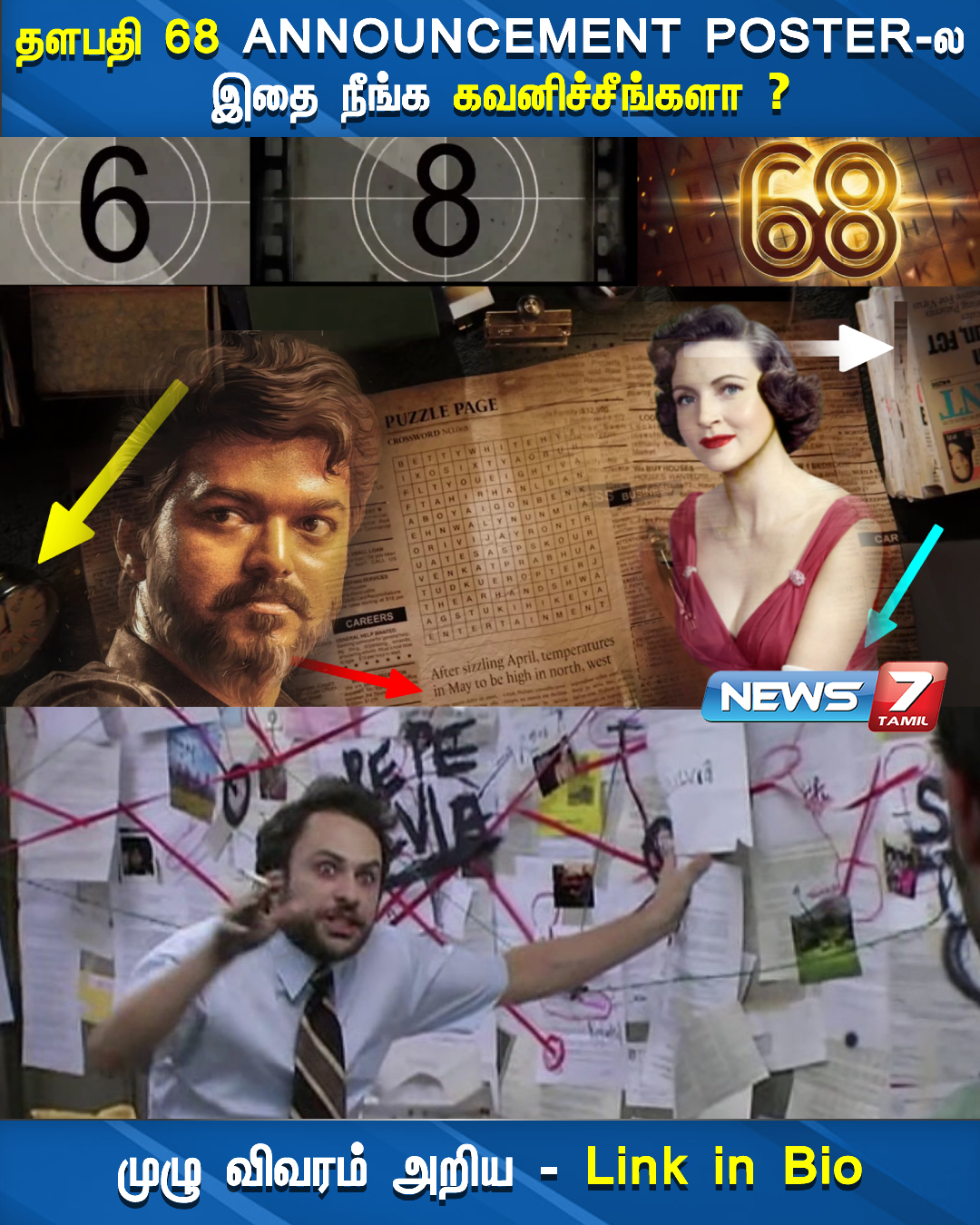 அது சற்று ஓய்ந்திருந்த நேரத்தில் திடீரென யாரும் எதிர்பாரா நேரத்தில் AGS நிறுவனத்திடமிருந்து “தளபதி 68 படத்தின் UPDATE நாளை வெளியாகும்” என அறிவிப்பு வந்து, இன்று அதன் ANNOUNCEMENT POSTER வெளியானது. அதில் சில நுணுக்கமான விஷயங்களும் சில HIDDEN DETAILSம் உள்ளன. அவை என்னவென்று இந்த தொகுப்பில் பார்க்கலாம்.