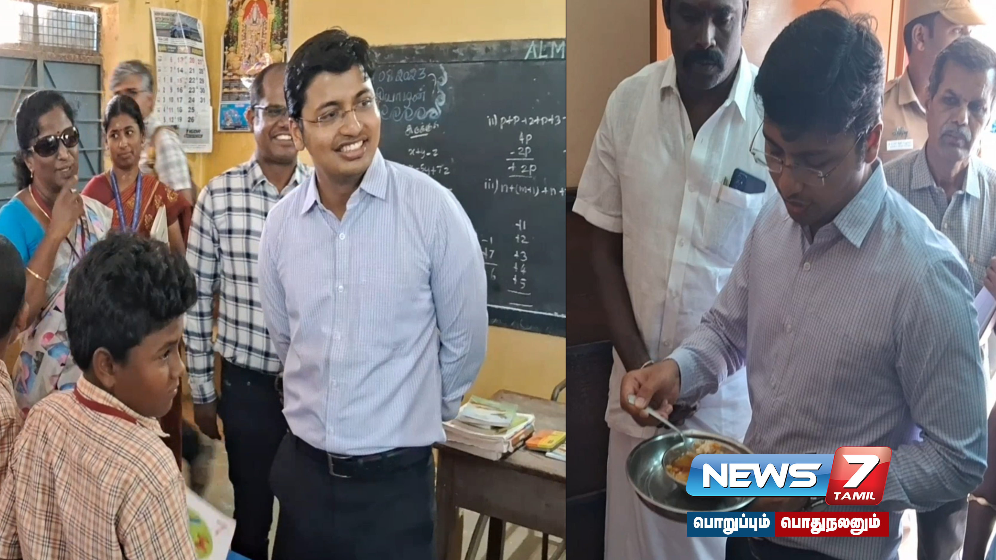 பின்னர் எதிர்பாராதவிதமாக மாணவர்களுக்கு சமைத்த சாப்பாட்டை வாங்கி சாப்பிட்டு சுவைத்து பார்த்து மாணவர்களுக்கு என்னென்ன உணவுகள் வழங்கப்படுகிறது, சாம்பாரில் என்னென்ன பொருட்கள் போடப்படுகிறது என அங்கிருந்த சத்துணவு பணியாளிடம் கேட்டறிந்தார்.