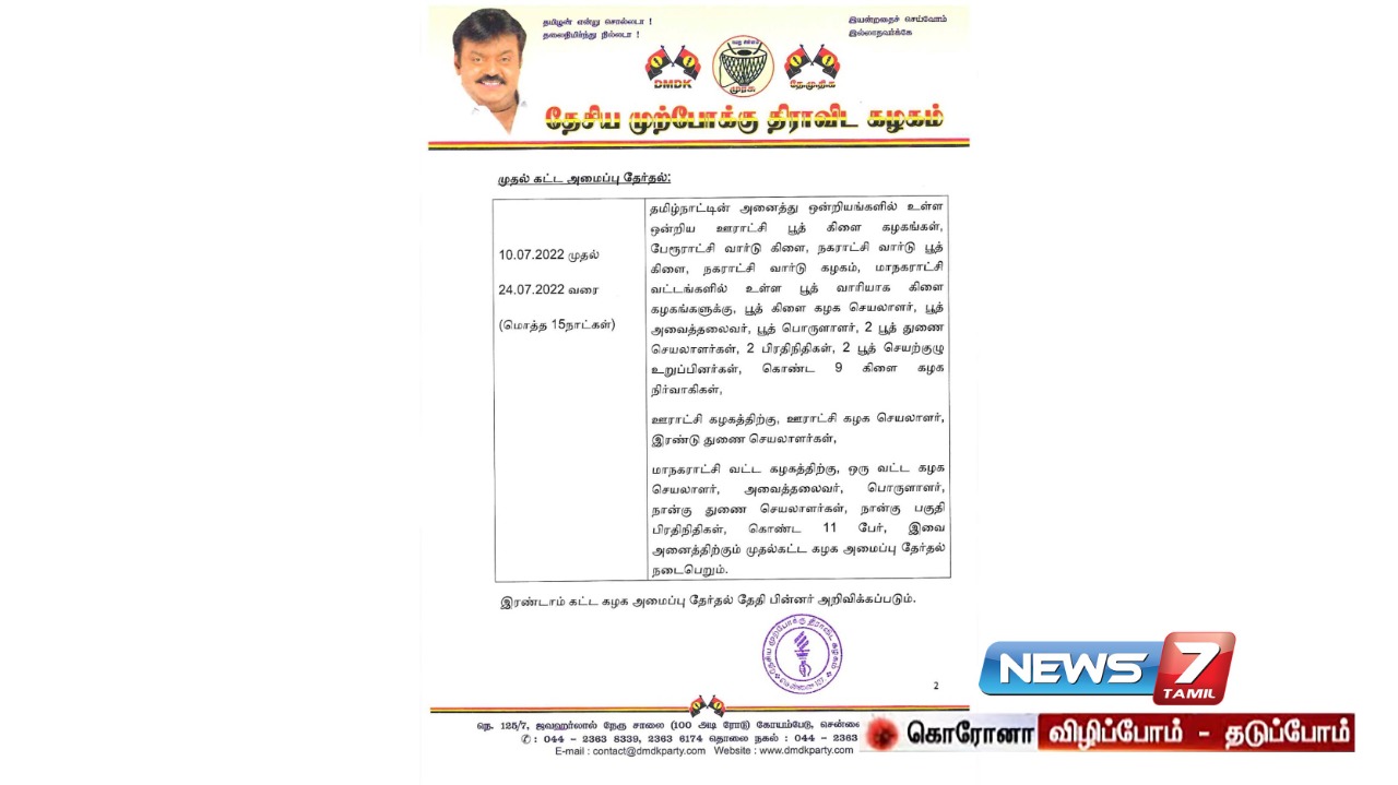 வருகின்ற ஜூலை 10 ஆம் தேதி தொடங்கி 24 ஆம் தேதி வரை தமிழ்நாட்டில் அனைத்து ஒன்றியங்களில் உள்ள ஒன்றிய ஊராட்சி பூத் கிளைகள், பேரூராட்சி வார்டு கிளை, நகராட்சி வார்டு பூத் கிளை, நகராட்சி வார்டு, மாநகராட்சி வட்டங்களில் உள்ள பூத் வாரியாக கிளைகளுக்கு பூத் கிளை செயலாளர், பூத் அவை தலைவர், பூத் பொருளாளர், இரண்டு பூத் துணைச் செயலாளர்கள், இரண்டு பிரதிநிதிகள், 2 பூத் செயற்குழு உறுப்பினர்கள் கொண்ட ஒன்பது கிளை நிர்வாகிகள், ஊராட்சி, ஊராட்சி செயலாளர், இரண்டு துணை செயலாளர்கள், மாநகராட்சி வட்டத்திற்கு ஒரு வட்ட செயலாளர், அவைத்தலைவர், பொருளாளர், நான்கு துணை செயலாளர்கள், நான்கு பகுதி பிரதிநிதிகள் கொண்ட பதினோரு பேர், இவை அனைத்திற்கும் முதல் கட்ட அமைப்பு தேர்தல் நடைபெறும் என அறிவிக்கப்பட்டுள்ளது. மேலும் இரண்டாம் கட்ட அமைப்பு தேர்தல் தேதி பின்னர் அறிவிக்கப்படும் என்றும் தேமுதிக தலைமை தெரிவித்துள்ளது.