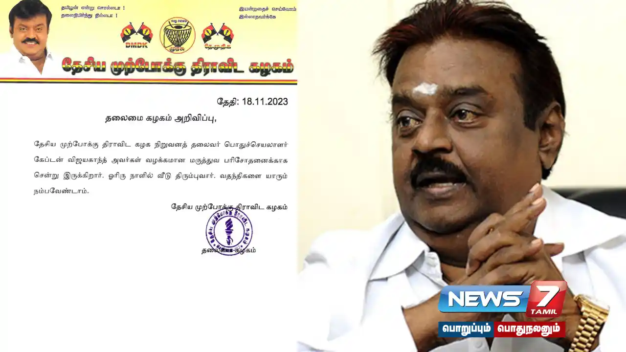 “ தேசிய முற்போக்கு திராவிட கழக நிறுவனத் தலைவர் பொதுச்செயலாளர் விஜயகாந்த் வழக்கமான மருத்துவ பரிசோதனைக்காக சென்று இருக்கிறார். ஓரிரு நாளில் வீடு திரும்புவார். வதந்திகளை யாரும் நம்பவேண்டாம். “ என தெரிவிக்கப்பட்டுள்ளது.