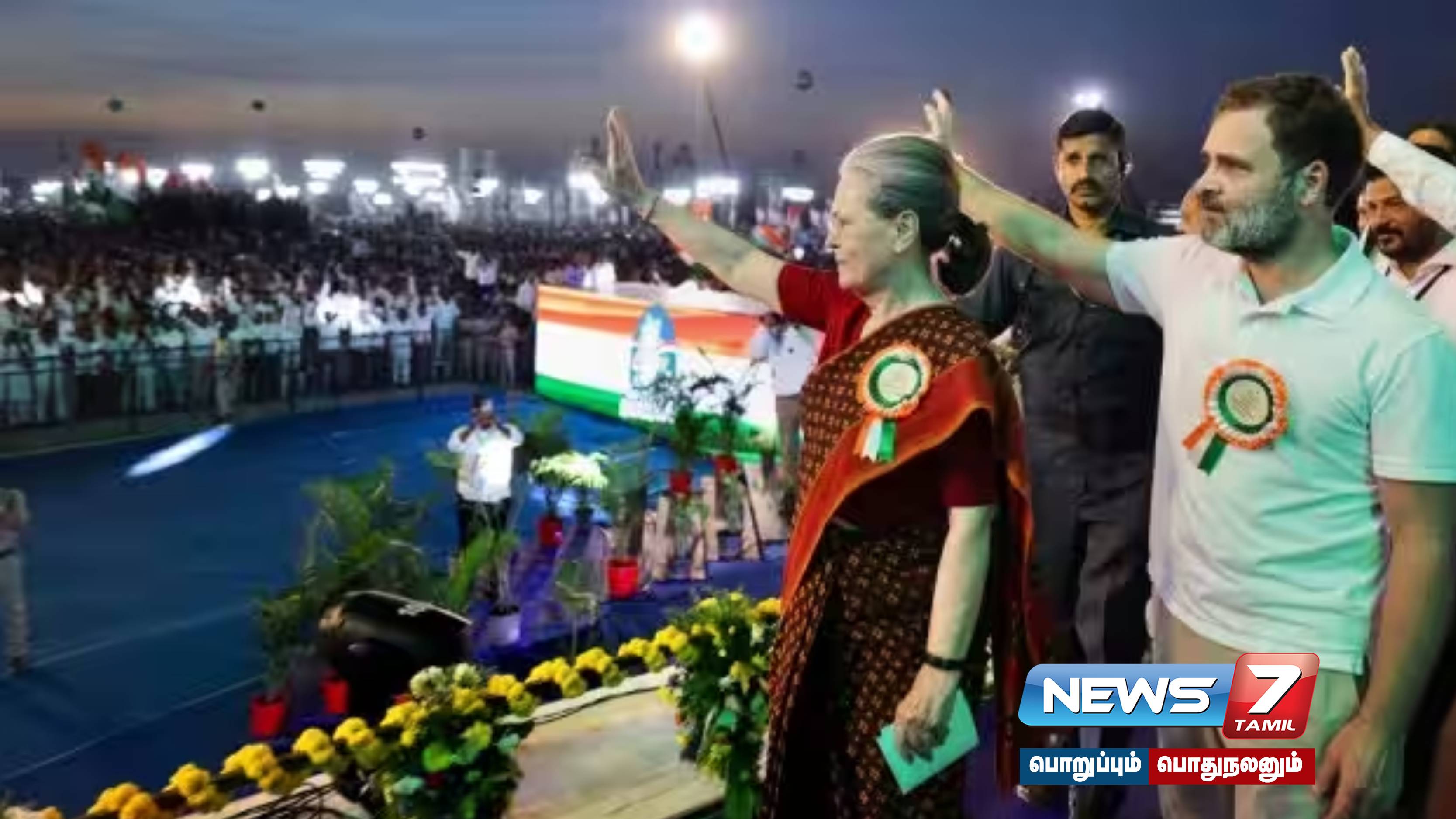 இந்நிலையில் காங்கிரஸ் கட்சியின் காரிய கமிட்டியின் 2 நாள் கூட்டம் தெலங்கானாவில் நடந்தது. இந்த கூட்டம் முடிந்த நிலையில் நேற்று ரங்கரெட்டி மாவட்டம் துக்குகூடா என்ற இடத்தில் காங்கிரஸ் கட்சியின் பொதுக்கூட்டம் நடந்தது. இந்த கூட்டத்தில் காங்கிரஸ் தேசிய தலைவர் மல்லிகார்ஜூன கார்கே, முன்னாள் காங்கிரஸ் தலைவர் சோனியா காந்தி, ராகுல் காந்தி உள்பட பல மூத்த தலைவர்கள் பங்கேற்றனர்.