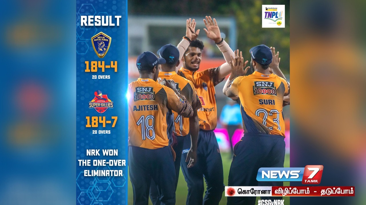 தமிழ்நாடு பிரீமியர் லீக் கிரிக்கெட் போட்டியின் முதல் ஆட்டத்தில் நெல்லை ராயல் கிங்ஸ் அணியும், சேப்பாக் சூப்பர் கில்லீஸ் அணியும் மோதின. இந்த ஆட்டத்தில் இரு அணிகளும் 184 ரன்கள் எடுத்ததால் ஆட்டம் சமனில் முடிந்தது. இதையடுத்து, சூப்பர் ஓவர் முறை கடைப்பிடிக்கப்பட்டது. இதில் நெல்லை ராயல் கிங்ஸ் அணி வெற்றி கண்டது.