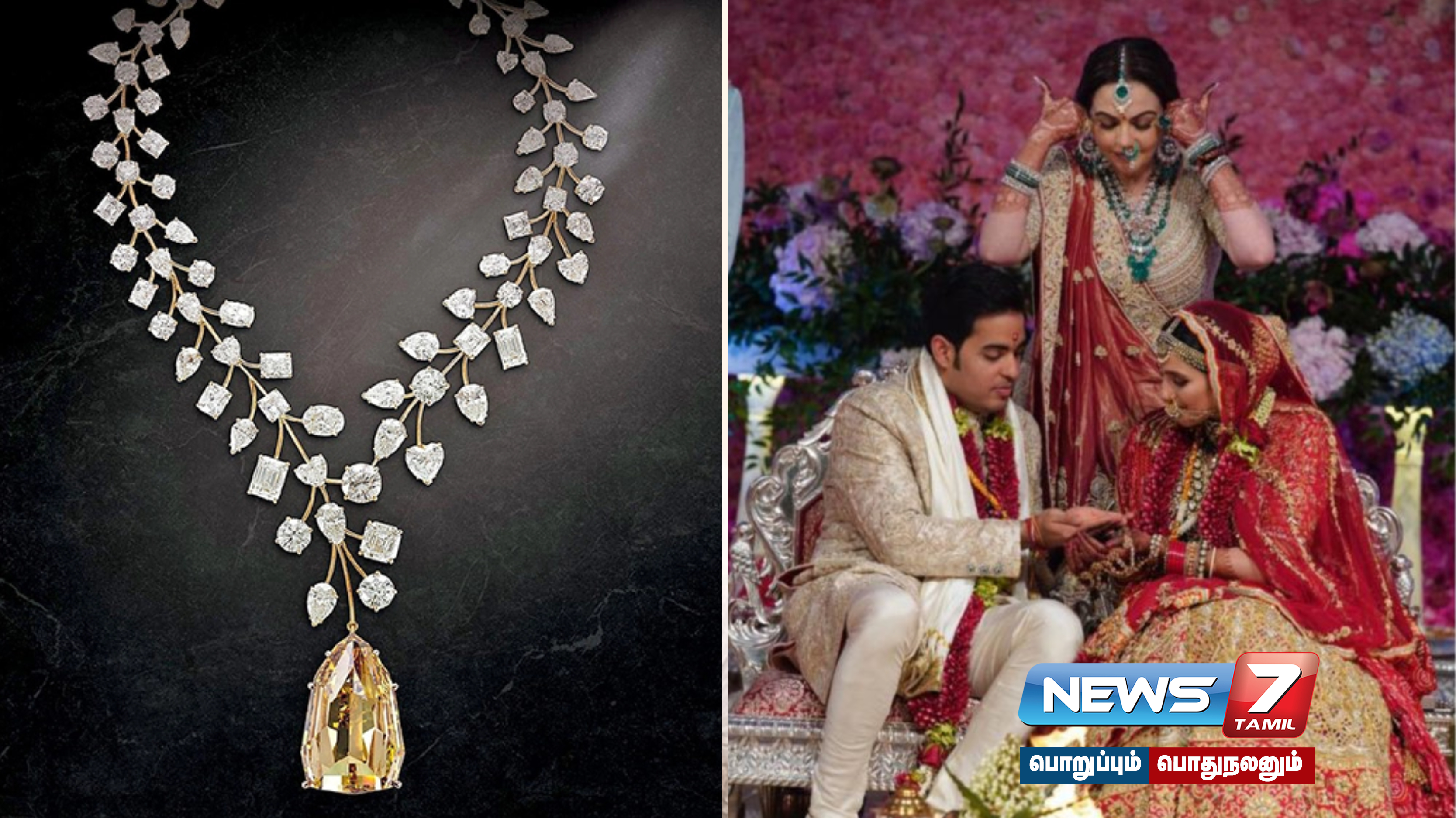 முகேஷ் அம்பானியின் மருமகள் அணிந்துள்ள வைர நெக்லஸின் மதிப்பு 500 கோடி ரூபாய் என கூறப்படுகிறது.