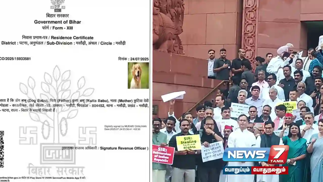 பீகார் மாநிலத்தில் வரும் நவம்பர் மாதம் சட்டபேரவைத்தேர்தல் நடைபெற உள்ளது. இதனைத் தொடர்ந்து 22 ஆண்டுகளுக்கு பிறகு பீகாரில் தீவிர சிறப்பு வாக்காளர் பட்டியல் திருத்தம் நடைபெற்று வருகிறது. இதனை கடுமையாக எதிர்த்த எதிர் கட்சிகள் 21ஆம் தேதி தொடங்கிய நாடாளுமன்ற மழைக்கால கூட்டத்தொடரில் தொடர் அமளியில் ஈடுபட்டு வருகின்றனர். இந்த நிலையில் பீகாரின் அரசு மிண்ணனு பொது சேவைகளை வழங்கும் ஆர்டிபிஎஸ் இணையதளத்தில், பாட்னா அருகே உள்ள மசௌரியில், ஒரு நாய்க்கு வழங்கப்பட்ட இருப்பிடச் சான்றிதழ் வைரலாகி வருகிறது.