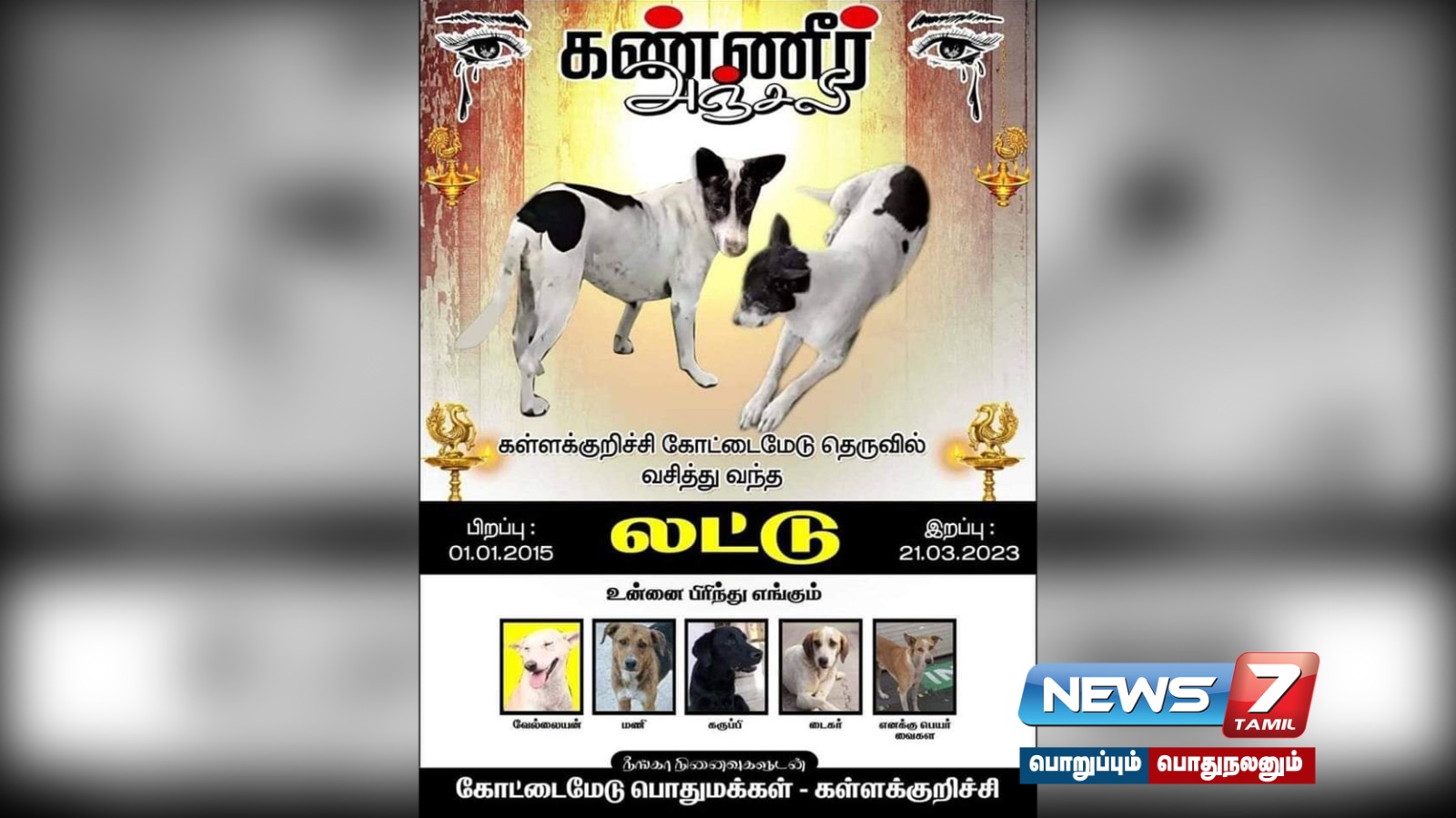 கள்ளக்குறிச்சி நகரில் உள்ள கோட்டைமேடு பகுதியில் லட்டு என்ற நாய் தெருமக்கள் அனைவராலும் பாசமாகவும், செல்லமாகவும் வளர்க்கப்பட்டு வந்தது.