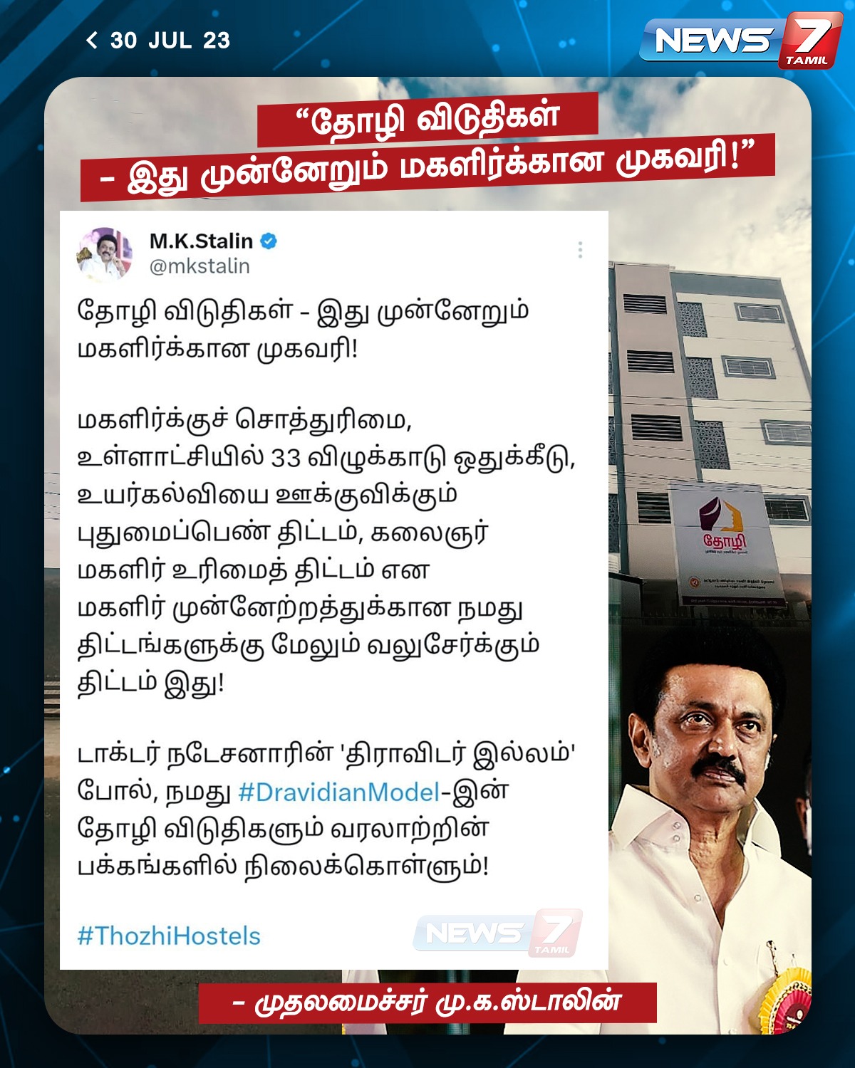 தமிழ்நாடு அரசின் தோழி விடுதிகள் திட்டம் தொடர்பாக முதலமைச்சர் மு.க.ஸ்டாலின் இன்று வெளியிட்டுள்ள ட்விட்டர் பதிவில் கூறியிருப்பதாவது;
