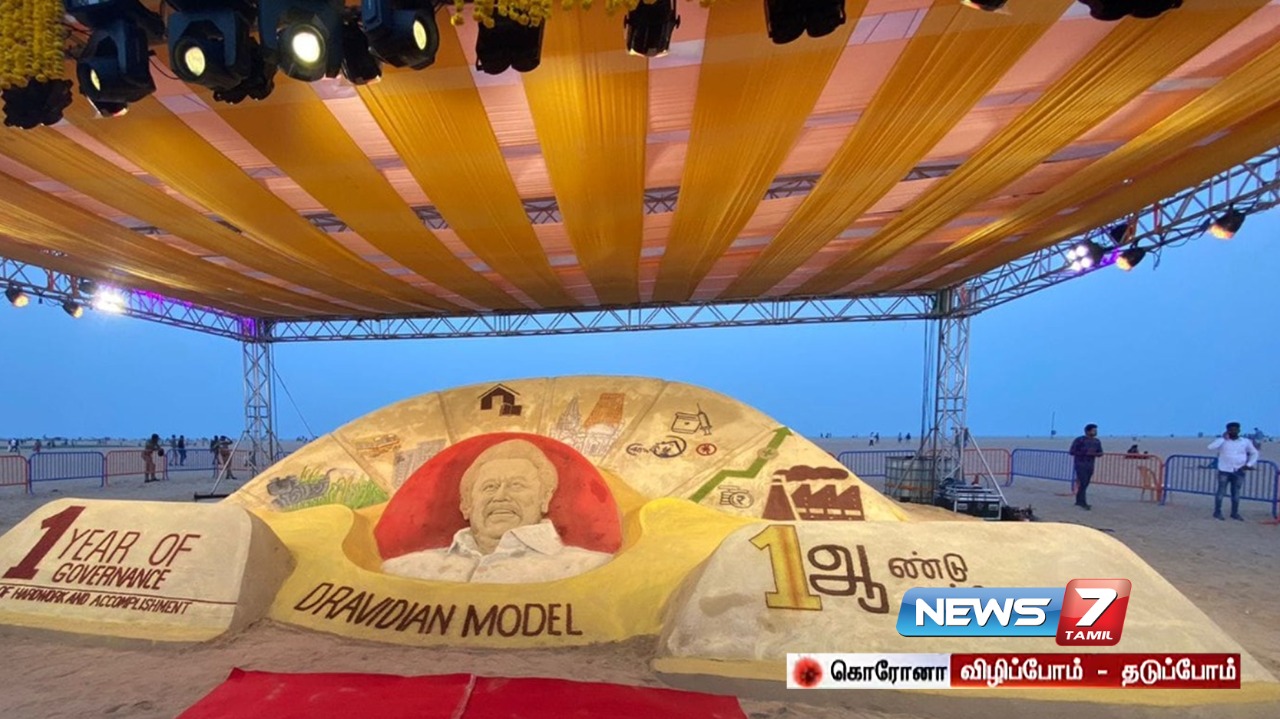 பத்திரிக்கையாளர் கோவி லெனின் பதிவிட்டுள்ள முகநூல் பதிவில், ‘தமிழ்நாடு முதலமைச்சர் மு.க.ஸ்டாலினின் ஓராண்டு கால செயல்பாடுகளை மக்களின் மனதில் பதியச் செய்வதற்கானப் பல வழிகள் இன்றைய தொழில்நுட்பத்தில் உண்டு. அதில், தனித்தன்மையுடன் கூடிய செயல்பாடு குறித்து தி.மு.க.வின் தகவல் தொழில்நுட்ப அணிச் செயலாளர் டி.ஆர்.பி.ராஜா எம்.எல்.ஏவுடன் ஆலோசித்தபோது, சட்டென ஒரு நொடியில் வெளிப்பட்டதுதான், மணற்சிற்பம். இந்தியாவின் அதிசிறந்த மணற் சிற்பக் கலைஞரும் தமிழ்நாட்டின் மீது தனிப் பற்றுக் கொண்டு திருவள்ளுவர், கருணாநிதி ஆகியோரை ஒடிசா கடற்கரைகளில் மணற் சிற்பமாக வடித்தவருமான பத்மஸ்ரீ விருதாளர் சுதர்சன் பட்நாயக்யை அழைத்து, சென்னை மெரினாவில் முதலமைச்சரின் ஓராண்டு காலச் சாதனைகளை மணற் சிற்பத்தில் வெளிப்படுத்துவது என முடிவு செய்யப்பட்டதாகவும், ஒருங்கிணைப்பு பணியை தன்னிடம் ஒப்படைக்கப்பட்டதாகவும் நெகிழ்ச்சிப்பட அவர் தெரிவித்துள்ளார்.