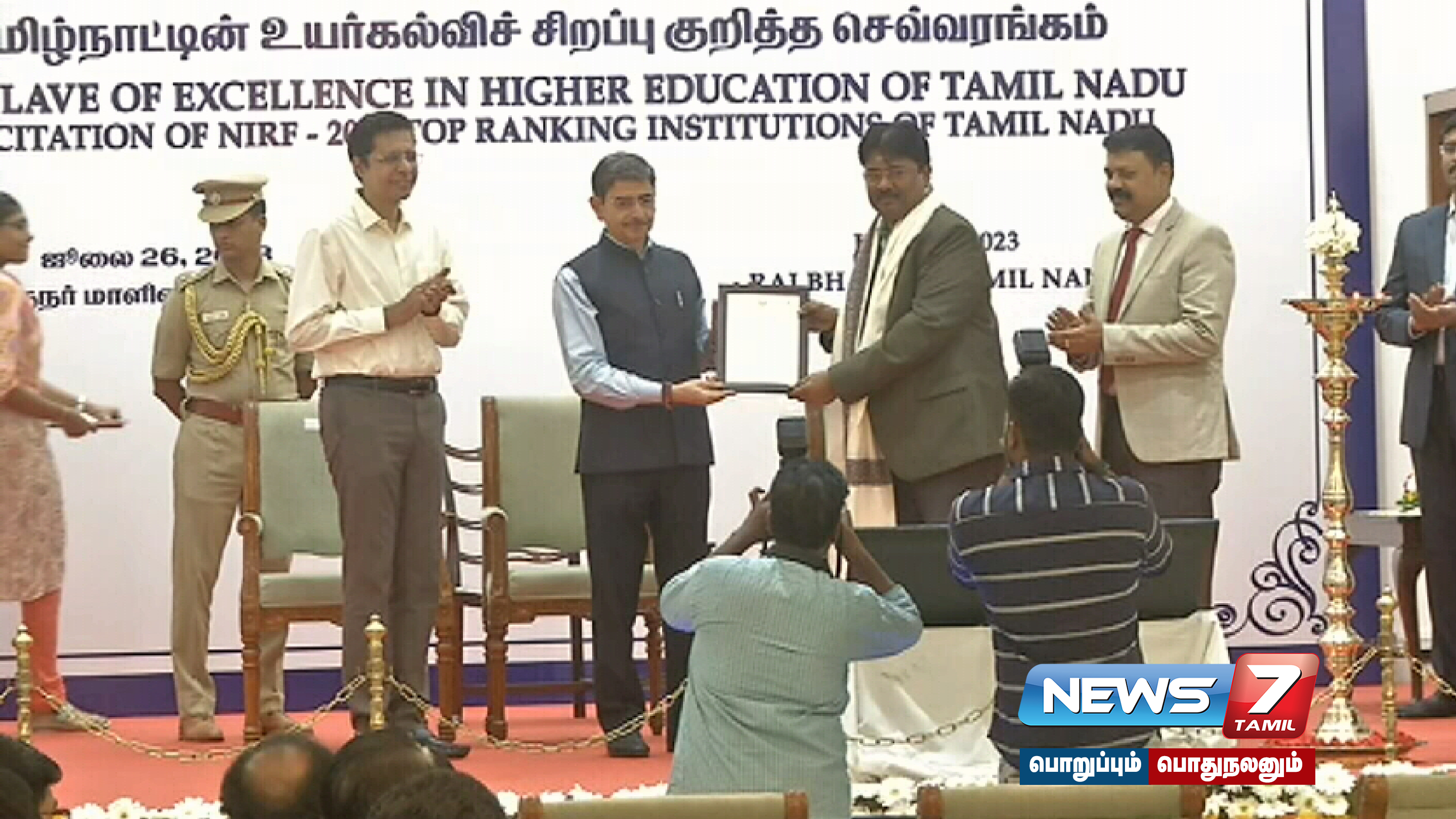 தமிழ்நாட்டின் உயர்கல்வியில் சிறந்து விளங்கி, 2023-ல் தேசிய நிறுவன தரவரிசையில் முதல் 10 இடங்களை பிடித்த கல்வி நிறுவனங்களுக்கு பாராட்டு விழா சென்னை கிண்டியில் உள்ள ஆளுநர் மாளிகையில் நடைபெற்றது. இதில் கல்லூரி முதல்வர்கள் மற்றும் பேராசிரியர்கள் கலந்து கொண்டனர். இந்நிகழ்ச்சியில் பங்கேற்ற ஆளுநர் ஆர்.என்.ரவி உயர் கல்வியில் முதலிடத்தைப் பெற்ற சென்னை பல்கலைக்கழகத்திற்கு சான்றிதழ்களை வழங்கினார்.