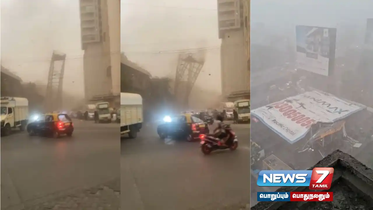 பெரும் துயர சம்பவமாக மும்பை காட்கோபர், கிழக்கு எக்ஸ்பிரஸ் நெடுஞ்சாலையில் உள்ள போலீஸ் கிரவுண்ட் பெட்ரோல் பங்கில் அமைக்கப்பட்டு இருந்த ராட்சத விளம்பர பலகை பலத்த காற்றுக்கு தாக்குப்பிடிக்க முடியாமல் சரிந்து விழுந்தது. சுமார் 100 அடி உயரம் கொண்ட இந்த பதாகை இரும்பு சாரங்களுடன் விழுந்ததால் பெட்ரோல் பங்க் மற்றும் அருகில் இருந்து வீடுகள் நொறுங்கின.