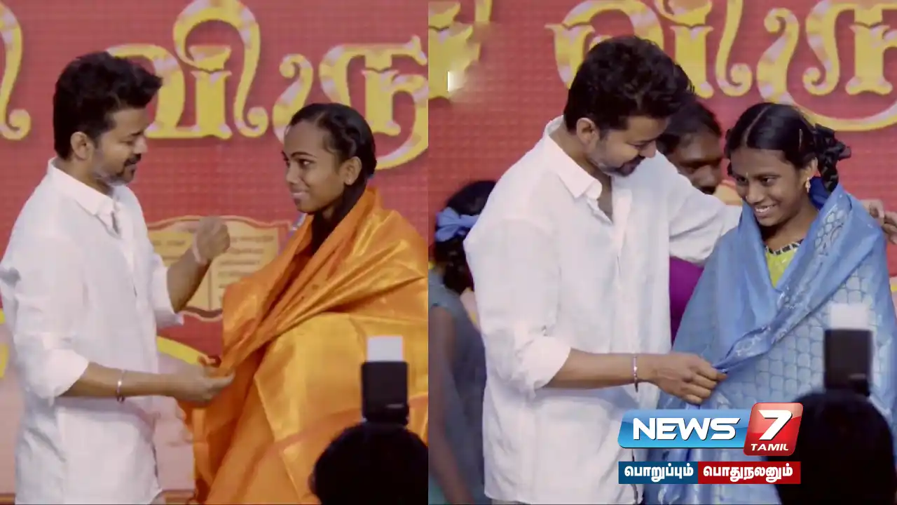 தமிழக வெற்றிக் கழகம் நடத்தும் கல்வி விருது வழங்கும் இரண்டாம் கட்ட நிகழ்வில் சிறப்பு பிரிவில் சென்னை சேப்பாக்கத்தைச் சேர்ந்த திருநங்கை மாணவிக்கும், புதுச்சேரியை சேர்ந்த பார்வை மாற்றுத்திறனாளி மாணவிக்கும் தவெக தலைவர் விஜய் பரிசுகள் வழங்கினார்.