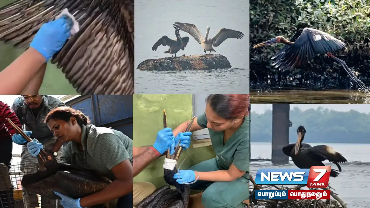 சென்னை எண்ணூர் பகுதியில் எண்ணெய் கழிவு தேங்கியதில், பாதிக்கப்பட்ட பல்வேறு வகை பறவைகளை மீட்கும் பணியில் பெசன்ட் மெமோரியல் கால்நடை மருத்துவமனை குழு ஈடுபட்டுள்ளது.