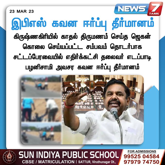 இந்த நிலையில் எதிர்க்கட்சித்தலைவர் எடப்பாடி பழனிசாமி கிருஷ்ணகிரியில் காதல் திருமணம் செய்து கொண்ட ஜெகன் கொடுரமான முறையில் கொலை செய்யப்பட்ட சம்பவம் அவசர கவன ஈர்ப்பு தீர்மானத்தை கொண்டு வந்தார். இச்சம்பவம் தொடர்பாக அரசு கடும் நடவடிக்கை எடுக்க வேண்டும் எடப்பாடி பழனிசாமி கேட்டுக் கொண்டார்.