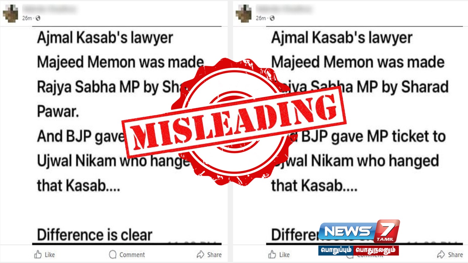 2024 மக்களவைத் தேர்தல் நடைபெற்று வரும் நிலையில், மும்பை தொடர் தாக்குதல் குற்றவாளியான அஜ்மல் கசாப்பின் வழக்கறிஞரான மஜீத்மேமனை தேசியவாத காங்கிரஸ் கட்சி ராஜ்யசபா எம்பி ஆக்கியது என்றும், கசாப் மீது வழக்குத் தொடுத்து மரண தண்டனையை உறுதி செய்த உஜ்வல் நிகாமுக்கு பாஜக எம்பி டிக்கெட் வழங்கியது என்றும் ஒரு பதிவு பரவலாகப் பேசப்படுகிறது. சமூக ஊடக தளங்களிலும் பகிரப்பட்டு வருகிறது. அவற்றை இணைப்பு 1, இணைப்பு 2, இணைப்பு 3 ஆகியவற்றில் காணலாம். இந்த பதிவுகளில் கூறப்பட்ட கூற்றை உண்மை சரிபார்ப்போம்.
