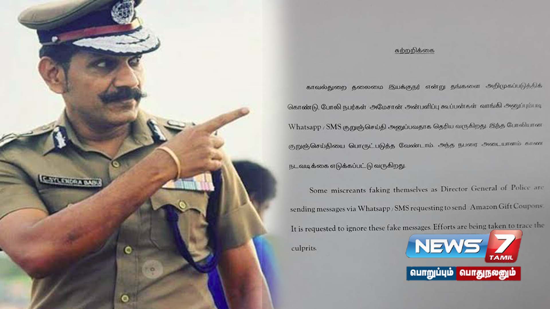 அதில், காவல்துறை தலைமை இயக்குநர் என்று தங்களை அறிமுகப்படுத்துக் கொண்டு போலி நபர்கள் அமேசான் அன்பளிப்பு கூப்பன்கள் வாங்கி அனுப்பும்படி Whatsapp SMS குறுஞ்செய்தி அனுப்பவதாக தெரிய வருகிறது. இந்த போலியான குறுஞ்செய்தியை பொருட்படுத்த வேண்டாம் என குறிப்பிட்டுள்ளார். அந்த நபரை அடையாளம் கண நடவடிக்கை எடுக்கப்பட்டு வருவதாகவும் விளக்கமளித்துள்ளார்.