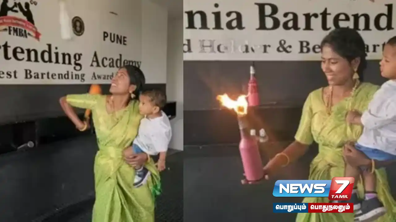 அவர் கையில் தனது 2 வயது குழந்தையை வைத்திருக்கிறார். மற்றொரு கையில் 2 பாட்டில்களை வைத்து மேலே சுழலவிட்டு பிடித்து சாகசம் செய்கிறார். அதேபோல பாட்டிலில் தீப்பற்ற வைத்து அதையும் சுழலவிட்டு பிடிக்கிறார். இந்த சாகசத்தில் ஈடுபடும் போது அவர் புடவையே கட்டியிருக்கிறார். அந்த பெண் புனே நகரை சேர்ந்த கவிதா மேதார் என்று தெரிய வந்தது. அவருக்கு இணையத்தில் பாராட்டுகள் குவிகின்றன.