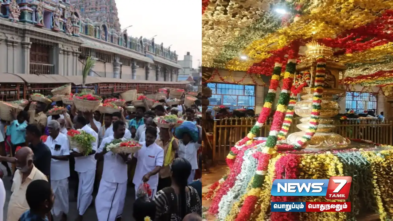 இதையடுத்து, விக்னேஸ்வர பூஜை, புண்ணியாக வாஜனம், அனுக்ஞை, வாஸ்து சாந்தி, அங்குரார்ப்பணம் பூஜைகளோடு இன்று காலை 7.15 மணியளவில் மீன லக்னத்தில் அம்மனுக்கு காப்பு கட்டப்பட்டு, பூஜைகளுக்கு பிறகு திருக்கோயில் இணை ஆணையர் சி. கல்யாணி தலைமையில் பக்தர்கள் பூதட்டுகளுடன் ஊர்வலமாக திருக்கோயிலை வலம் வந்து, அம்மனுக்கு பூக்கள் பூச்சொரிதல் விழா நடைபெற்றது.தமிழ்நாட்டின் பல்வேறு பகுதிகளில் இருந்து அலங்கரிக்கப்பட்ட வாகனங்களில் பூக்கள் கொண்டு வந்தனர்.