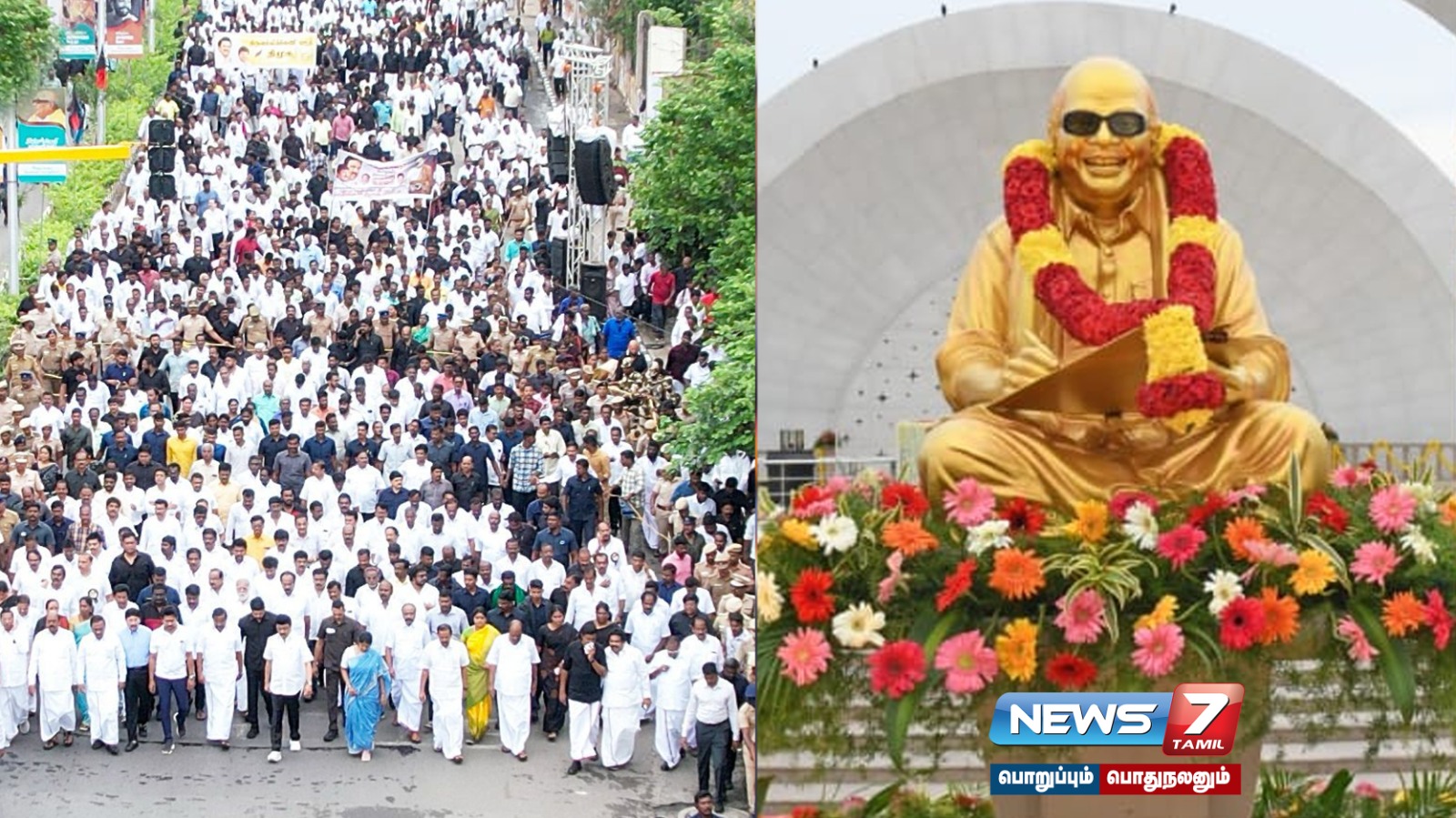 முன்னாள் முதலமைச்சர் கருணாநிதி நினைவு தினத்தையொட்டி, முதலமைச்சர் மு.க.ஸ்டாலின் தலைமையில் சென்னையில் அமைதிப் பேரணி இன்று நடைபெற்றது.