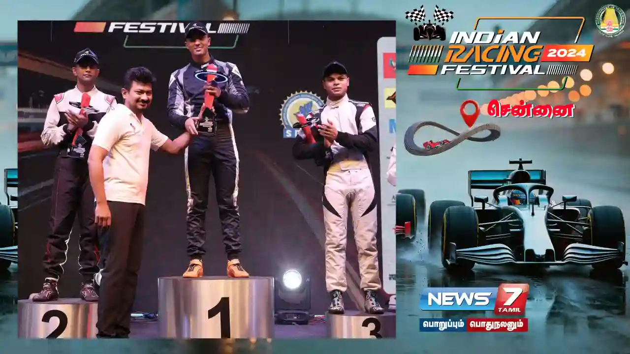 பார்முலா 4 கார் பந்தயம் நிறைவு பெற்றதை தொடர்ந்து முதலிடம் பிடித்த ஹைதராபாத் வீரர் அலி பாய் உட்பட முதல் மூன்று இடம்பெற்ற வீரர்களுக்கு அமைச்சர் உதயநிதி ஸ்டாலின் பரிசுகளை வழங்கினர்.