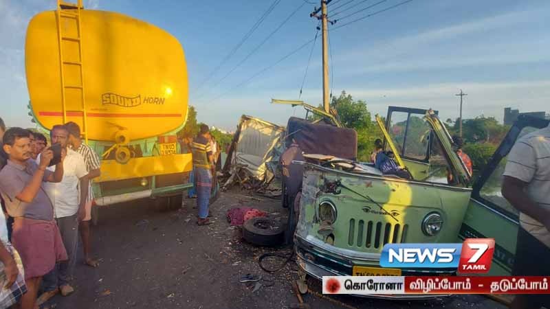 தூத்துக்குடி அருகே தண்ணீர் லாரி – வேன் மோதிக்கொண்ட விபத்தில் நான்கு பேர் உடல் நசுங்கி உயிரிழந்தனர்.