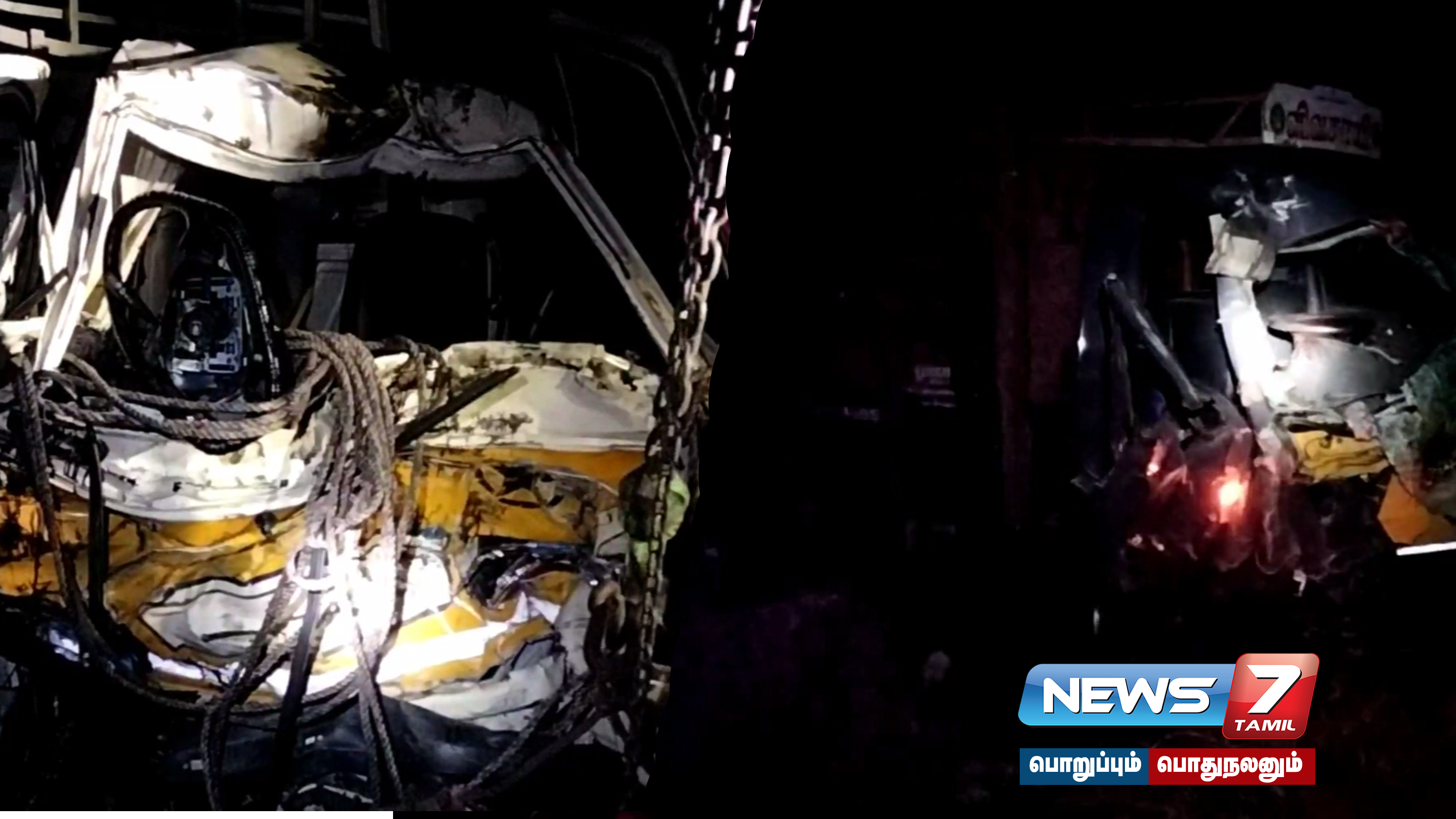 கரூர் தென்னிலை அருகே நேருக்கு நேர் இரு கனரக வாகனங்கள் மோதிய விவத்தில் 4 பேர் உயிரிழந்தனர்.