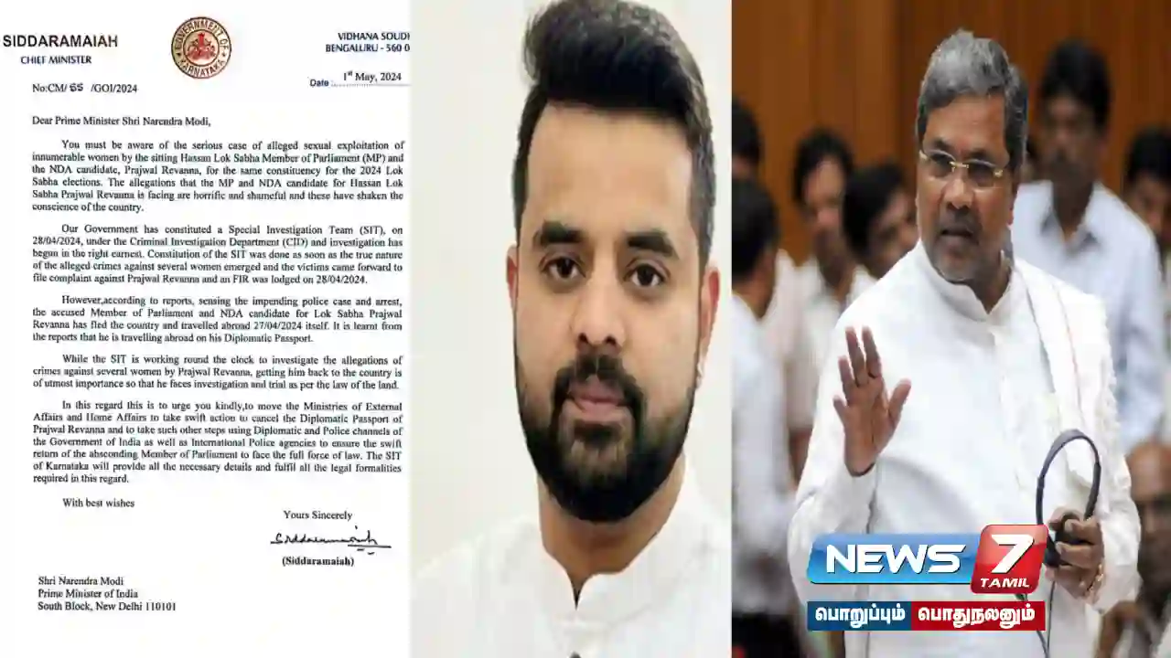 பிரஜ்வல் ரேவண்ணா பாஸ்போர்ட்டை முடக்குமாறு பிரதமர் மோடிக்கு கர்நாடக முதலமைச்சர் சித்தராமையா கடிதம் எழுதியுள்ளார்.