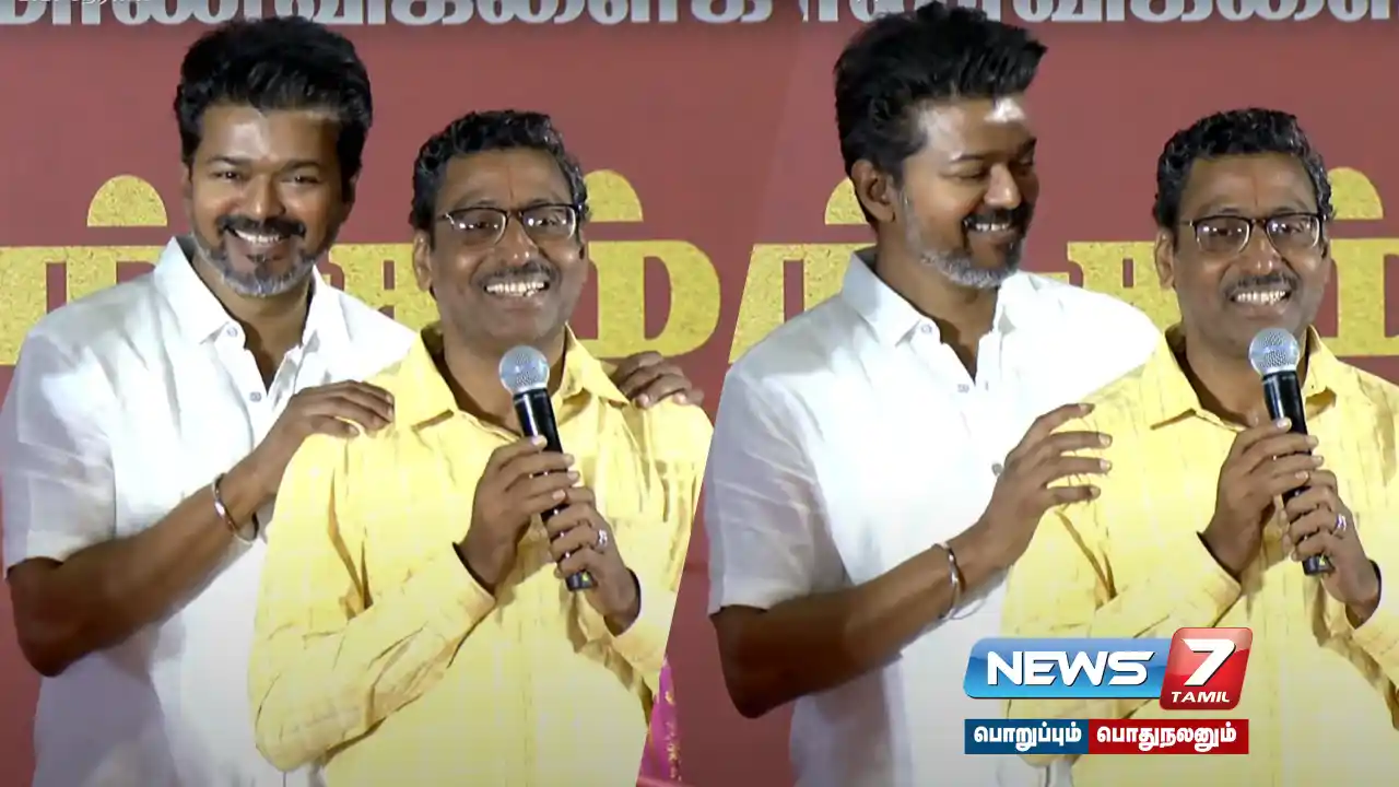 மாணவரின் பெற்றோர் விஜய் குறித்து பேசுகையில், “கல்விக்கு இவ்வளவு பெரிய தொண்டு செய்வதால், இன்றிலிருந்து விஜய் ‘இளைய காமராஜர்’ என்று அழைக்கப்பட வேண்டும் என கேட்டுக்கொள்கிறேன். அடுத்த ஆண்டு தமிழ்நாடு முதலமைச்சராக பரிசு வழங்க வேண்டும் என ஆசைபடுகின்றேன். அதனை நீங்கள் அனைவரும் நிறைவேற்றுவீர்கள் என எதிர்பார்க்கிறேன்” என தெரிவித்தார். அதற்கு தவெக தலைவர் விஜய் ஷாக் ஆகி மாணவரின் தந்தையின் தோளில் கைது வைத்தவாறு சிரித்தார். இது தொடர்பான காணொலியை விஜயின் ரசிகர்கள் மற்றும் தவெக தொண்டர்கள் அதிகமாக பகிர்ந்து வருகின்றனர்.