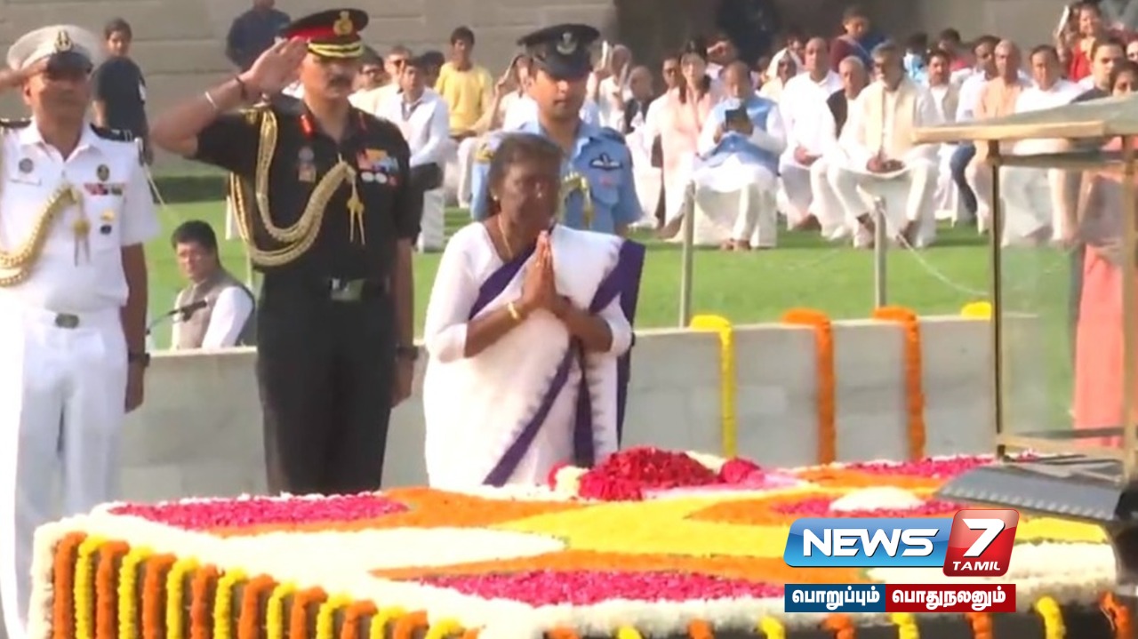 காந்தி ஜெயந்தியை முன்னிட்டு டெல்லி ராஜ்காட்டிலுள்ள அவரது நினைவிடத்தில் குடியரசு தலைவர் திரௌபதி முர்மு, பிரதமர் மோடி உள்ளிட்டோர் மலர்தூவி மரியாதை செலுத்தினர்.