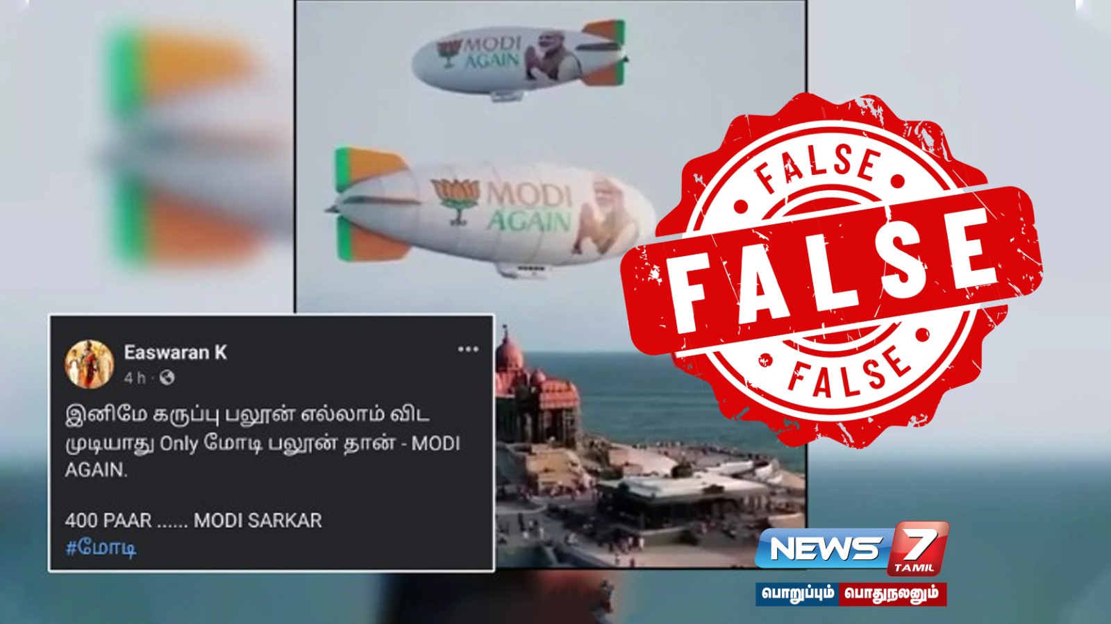 பிரதமர் மோடியின் கன்னியாகுமரி வருகையைத் தொடர்ந்து “இனிமே கருப்பு பலூன் எல்லாம் விட முடியாது Only MODI AGAIN. 400 PAAR MODI SARKAR” என்ற கேப்ஷனுடன் புகைப்படம் மற்றும் காணொலி சமூக வலைதளங்களில் வைரலாகி வருகிறது. அதில், கன்னியாகுமரியில் உள்ள விவேகானந்தர் மண்டபத்தின் மேலே “MODI AGAIN” என்ற வாசகம் பொறிக்கப்பட்ட ராட்சத விமானம் வடிவிலான பலூன்கள் பறப்பது போன்ற காட்சி பதிவாகியுள்ளது.