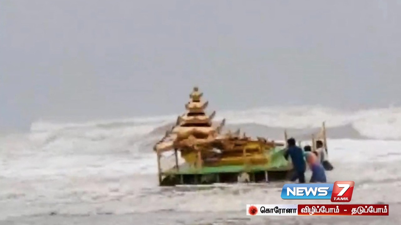 அசானி புயல் காரணமாக ஆந்திர பிரதேச மாநிலத்தில் கடும் கடல் கொந்தளிப்பு காணப்பட்டது. இந்நிலையில் சுன்னப்பள்ளி கடல் துறைமுகத்தில் கடல் கொந்தளிப்பால் தங்க நிற தேர் ஒன்று கடலில் மிதந்து வந்து கரை ஒதுங்கியது.