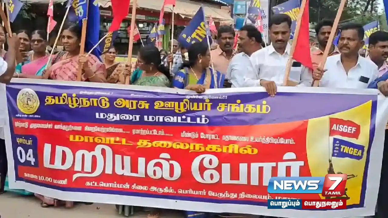 புதிய பென்ஷன் திட்டத்தை ரத்து செய்து பழைய பென்ஷன் திட்டத்தை மீண்டும் அமல்படுத்த வேண்டும், காலி பணியிடங்களை நிரப்பிட வேண்டும், ஆறு லட்சத்திற்கும் மேற்பட்ட இளைஞருக்கு வேலை வழங்கிட வேண்டும், 21 மாத நிலுவை தொகையை வழங்கிட வேண்டும் உள்ளிட்ட 12 அம்ச கோரிக்கைகளை நிறைவேற்றிட வலியுறுத்தி, மதுரை, நாமக்கல், கடலூர், தேனி, திருவள்ளூர், தென்காசி உள்ளிட்ட தமிழ் நாட்டின் பல்வேறு மாவட்டங்களில் தமிழ்நாடு அரசு ஊழியர் சங்கம் சார்பில் போராட்டம் நடத்தப்பட்டது. இதில் எராளமான அரசு ஊழியர்கள் கலந்து கொண்டனர். அப்போது அவர்கள் கோரிக்கைகளை நிறைவேற்ற கோரி முழக்கங்களை எழுப்பினர்.