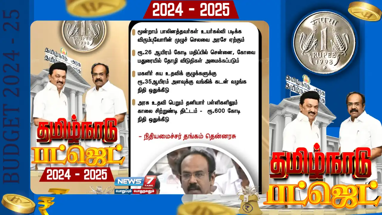 இதனைத்தொடர்ந்து, முதலமைச்சர் மு.க.ஸ்டாலின் தமிழ்நாடு சட்டப்பேரவைக்கு வருகை தந்தார். அவரை சந்தித்து நிதியமைச்சர் தங்கம் தென்னரசு வாழ்த்து பெற்றார். அதன்பின், நிதியமைச்சர் தங்கம் தென்னரசு 2024-25 ஆம் நிதியாண்டுக்கான பட்ஜெட் உரையின் தொடக்கத்தில் காட்சிக்கு எளிமையும், கடுஞ்சொல் கூறாத இனிய பண்பாடும் உடைய அரசைத்தான் உலகம் புகழும் என்ற திருக்குறளை மேற்கோள் காட்டி பட்ஜெட் உரையை தொடங்கினார்.