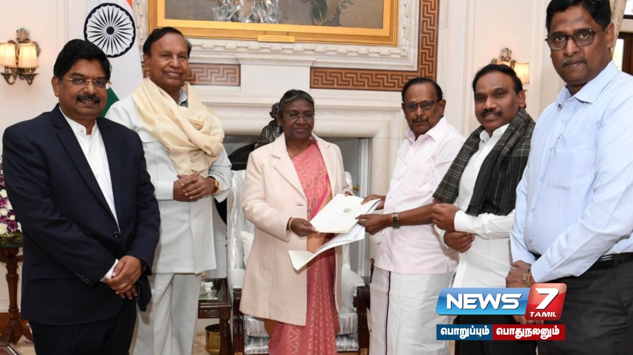 தமிழ்நாடு ஆளுநர் விவகாரம் குறித்து குடியரசுத் தலைவர் திரௌபதி முர்முவுடன் சட்ட அமைச்சர் ரகுபதி தலைமையில் நாடாளுமன்ற உறுப்பினர்கள் டி.ஆர்.பாலு, ஆ.ராசா, பி.வில்சன், என்.ஆர்.இளங்கோ ஆகியோர் சந்தித்து, கோரிக்கை மனுவையும், தமிழ்நாடு முதலமைச்சர் மு.க.ஸ்டாலின் எழுதிய கடிதத்தையும் வழங்கினர்.