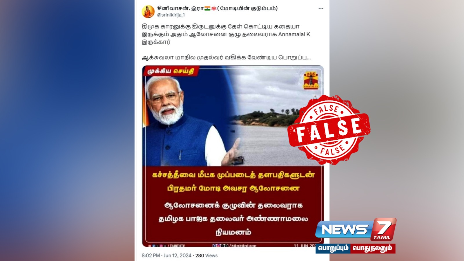 கச்சத்தீவு மீட்பு ஆலோசனை குழுவின் தலைவராக அண்ணாமலையை பிரதமர் மோடி நியமித்ததாக சமூக வலைத்தளங்களில் பரவும் நியூஸ்கார்டு முற்றிலும் போலியானதாகும். இந்த உண்மையானது நமக்கு கிடைத்த ஆதாரங்களின் வாயிலாக தெளிவாகியுள்ளது.