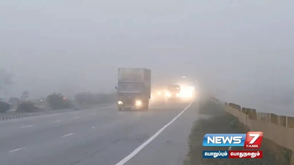 நெடுஞ்சாலை, திருவள்ளூர் ஊத்துக்கோட்டை சாலை, திருவள்ளூர் செங்குன்றம் சாலை உள்ளிட்ட இடங்களில் வெள்ளை போர்வை போற்றியது போல் பனிமூட்டம்