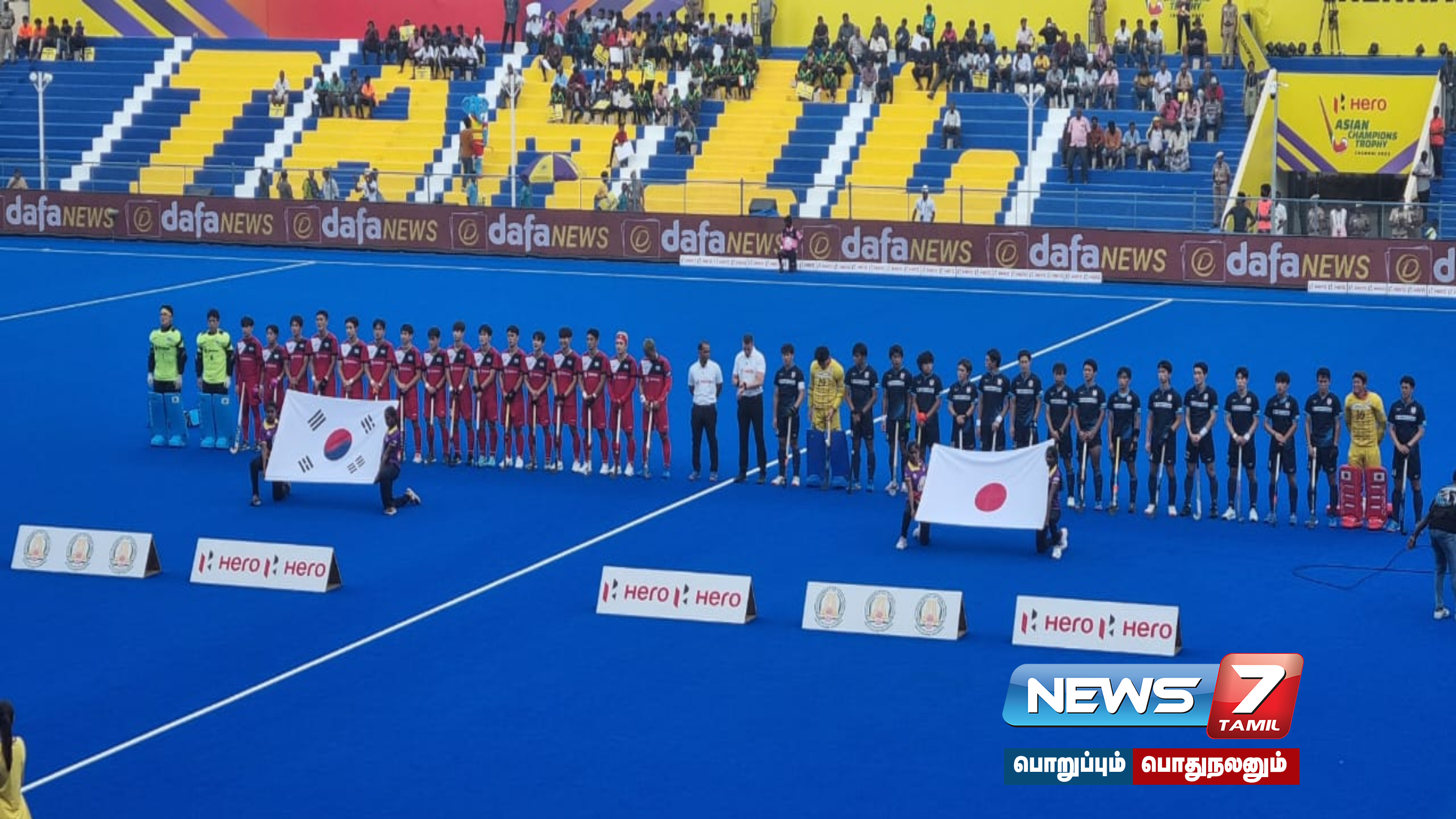 ஜப்பான் மற்றும் தென் கொரியா அணிகள் மோதும் 7-வது ஆசிய ஆடவர் சாம்பியன்ஸ் கோப்பைகான ஹாக்கி தொடரின் முதல் போட்டி இரு நாடுகளின் தேசிய கீதம் ஒலிக்க சென்னையில் இன்று துவங்கியது.