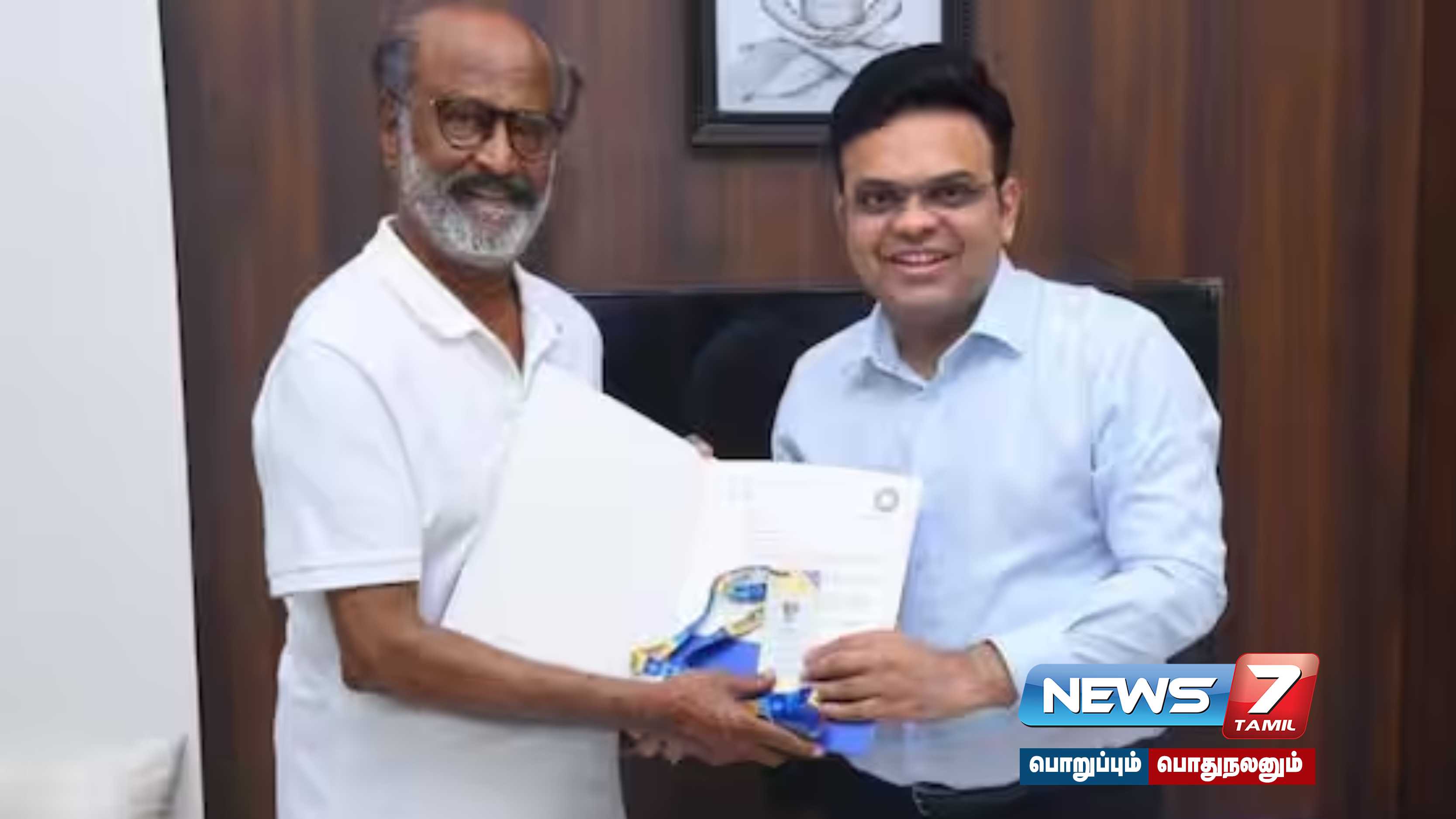 நடிகர் ரஜினிகாந்தை இன்று நேரில் சந்தித்த பிசிசிஐ பொதுச் செயலாளர் ஜெய் ஷா, கோல்டன் டிக்கெட்டை வழங்கினார்.