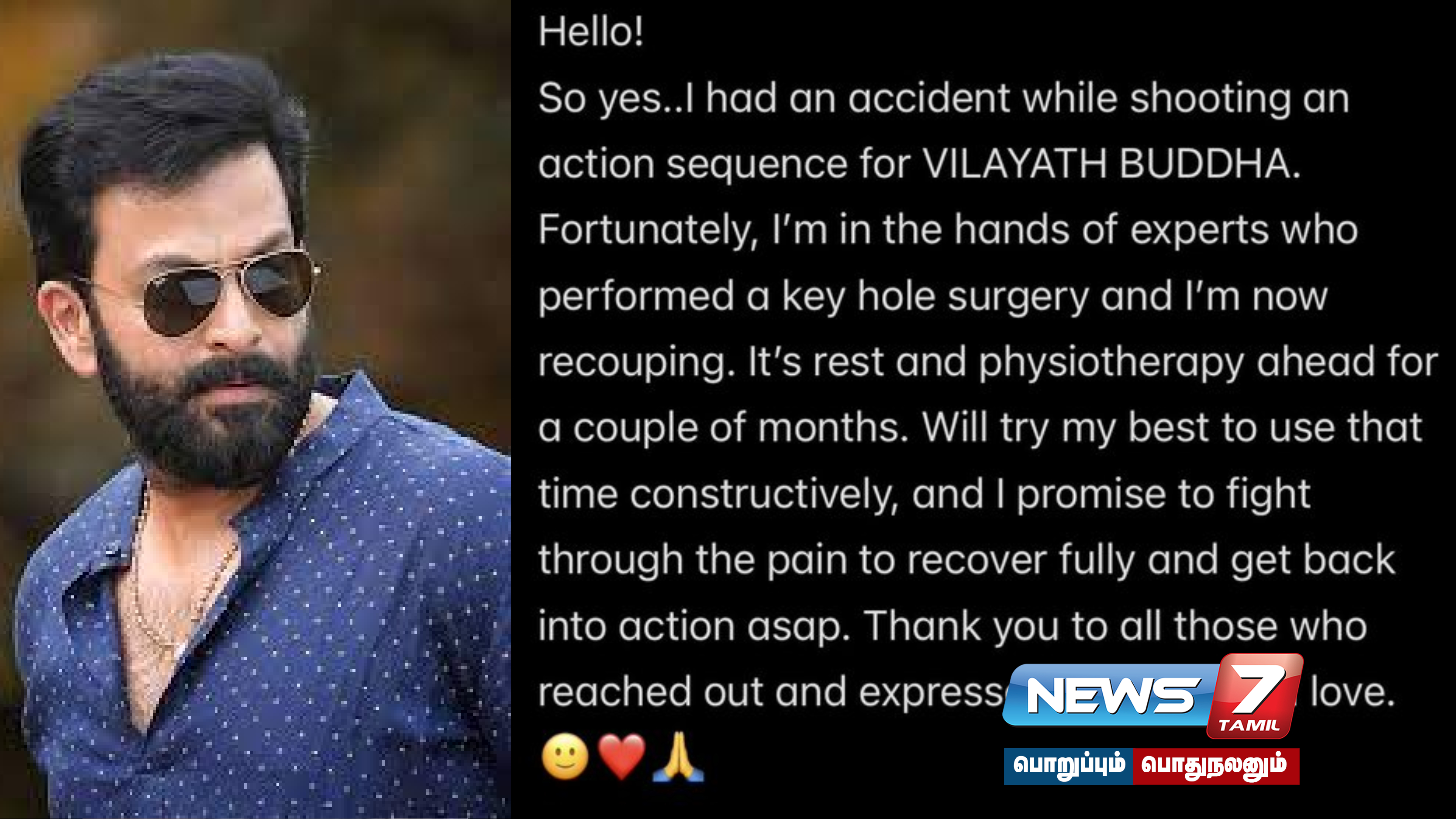 விளையாத் புத்தா படப்பிடிப்பின் போது பலத்த காயமடைந்த நடிகர் பிருத்விராஜ் தன் உடல்நலம் குறித்து இணையத்தில் கருத்து பதிவிட்டுள்ளார்.