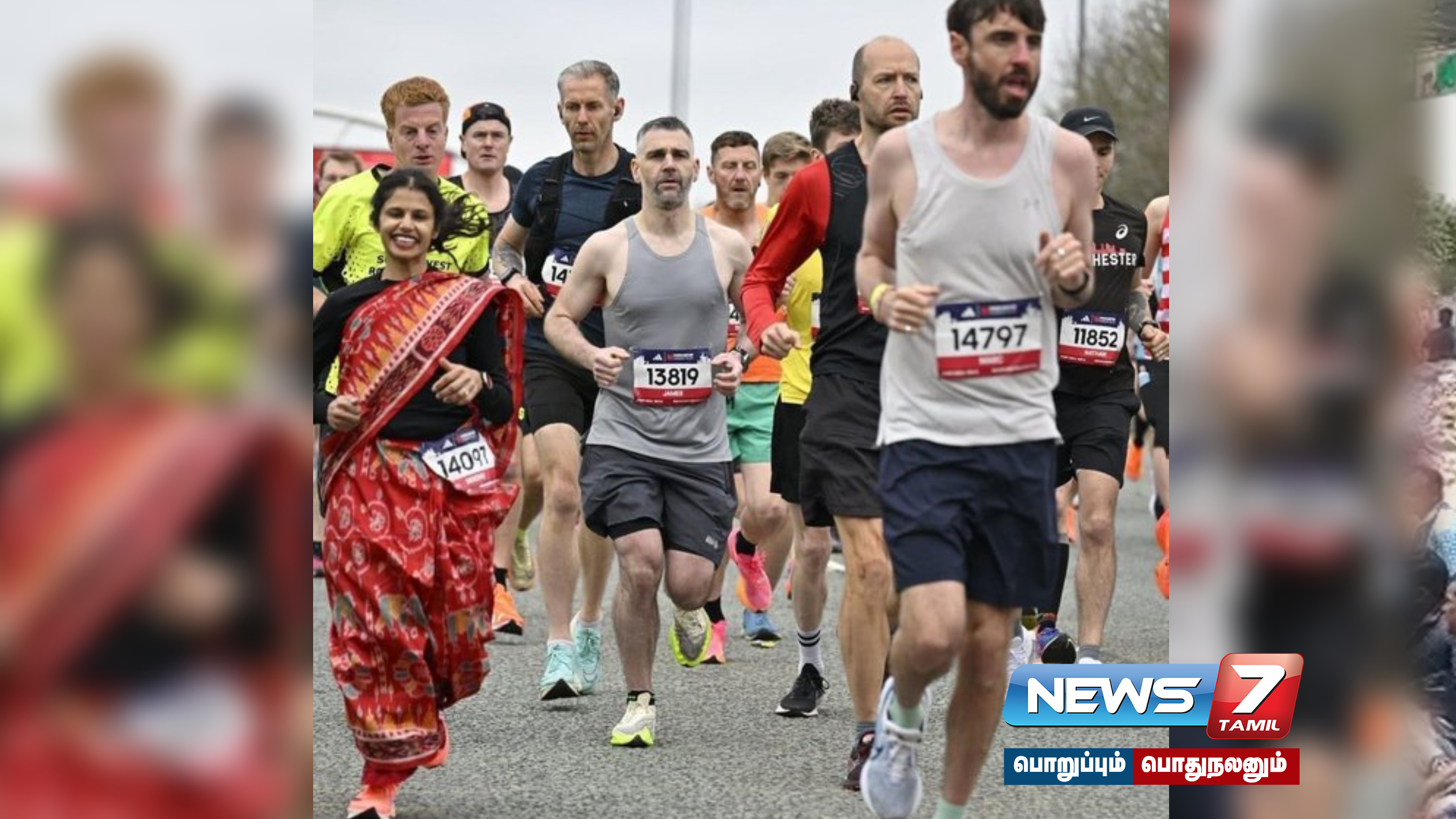 இங்கிலாந்தில் சேலை அணிந்து மாரத்தானில் பங்கெடுத்த ஒடிசாவைச் சார்ந்த பெண் 42.5 கிமீ தூரத்தை 4 மணி 50 நிமிடத்தில் கடந்துள்ளார்.