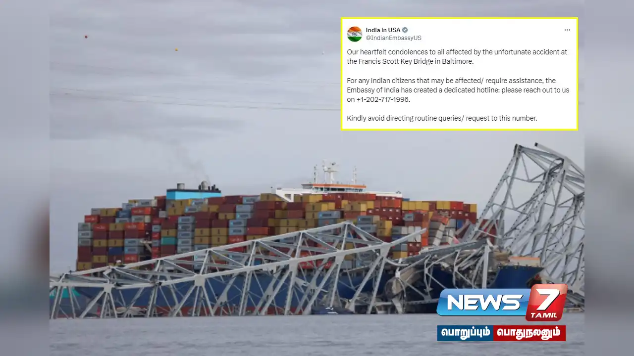 அமெரிக்காவில் சரக்கு கப்பல் மோதி பாலம் உடைந்து விபத்துக்குள்ளானதில், பாதிக்கப்பட்ட அல்லது உதவி தேவைப்படக்கூடிய இந்தியர்கள் தொடர்பு கொள்ள வேண்டிய எண்ணை இந்திய தூதரகம் அறிவித்துள்ளது.