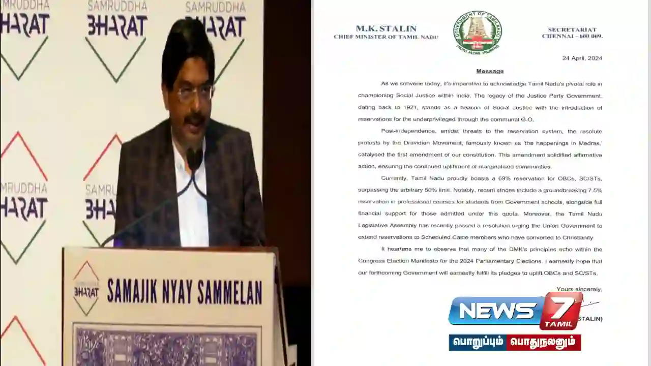 மேலும், கிறித்தவத்துக்கு மதம் மாறிய ஆதி திராவிடர்களுக்கும் இட ஒதுக்கீடு வழங்க வழிவகை செய்ய வேண்டும் என்ற தீர்மானத்தையும் அண்மையில் தமிழ்நாடு சட்டப்பேரவை நிறைவேற்றியுள்ளது. தி.மு.கழகத்தின் சமூகநீதிக் கொள்கைகளை எதிரொலிக்கும் வகையில் காங்கிரஸ் கட்சியின் 2024 தேர்தல் அறிக்கை அமைந்துள்ளதைக் கண்டு நான் உவப்படைகிறேன். அடுத்து அமையவுள்ள நமது அரசு பிற்படுத்தப்பட்டோர், பட்டியல் மற்றும் பழங்குடியினத்தவர்களை உயர்த்தும் வகையில் தனது வாக்குறுதிகளை நிறைவேற்றும் என மிகுந்த நம்பிக்கையோடு இருக்கிறேன்.இட ஒதுக்கீட்டை அதிகரிக்க இந்தியா கூட்டணி நடவடிக்கை எடுக்கும்” என குறிப்பிடப்பட்டிருந்தது.