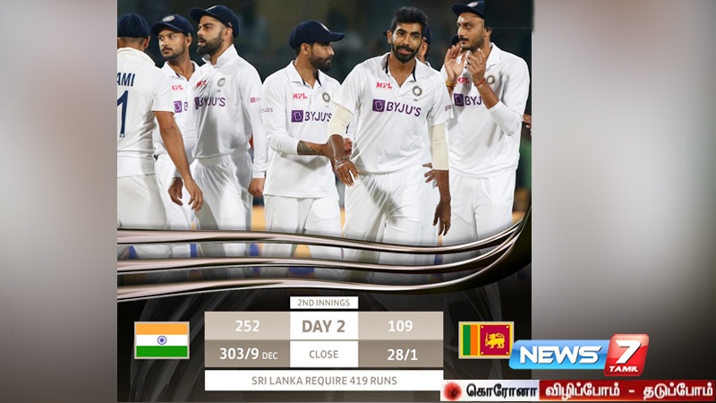 இந்தியா உடனான டெஸ்ட் போட்டியின் இரண்டாம் நாள் ஆட்டநேர முடிவில் இலங்கை அணி 1 விக்கெட் இழப்பிற்கு 28 ரன்கள் எடுத்துள்ளது.
