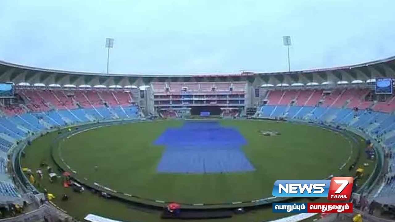 தற்போது மைதானத்தில் சாரல் மழை பெய்து வருவதால் மைதானத்தின் பிட்ச் “கவர்ஸ்” கொண்டு மூடப்பட்டுள்ளது. மழை குறுக்கிட்டுள்ளதால் ரசிகர்கள் ஏமாற்றம் அடைந்துள்ளனர். மழை நின்றபின் மீண்டும் போட்டி தொடங்கபட்டால் ஓவர்கள் குறைக்கப்படலாம் என எதிர்பார்க்கப்படுகிறது.