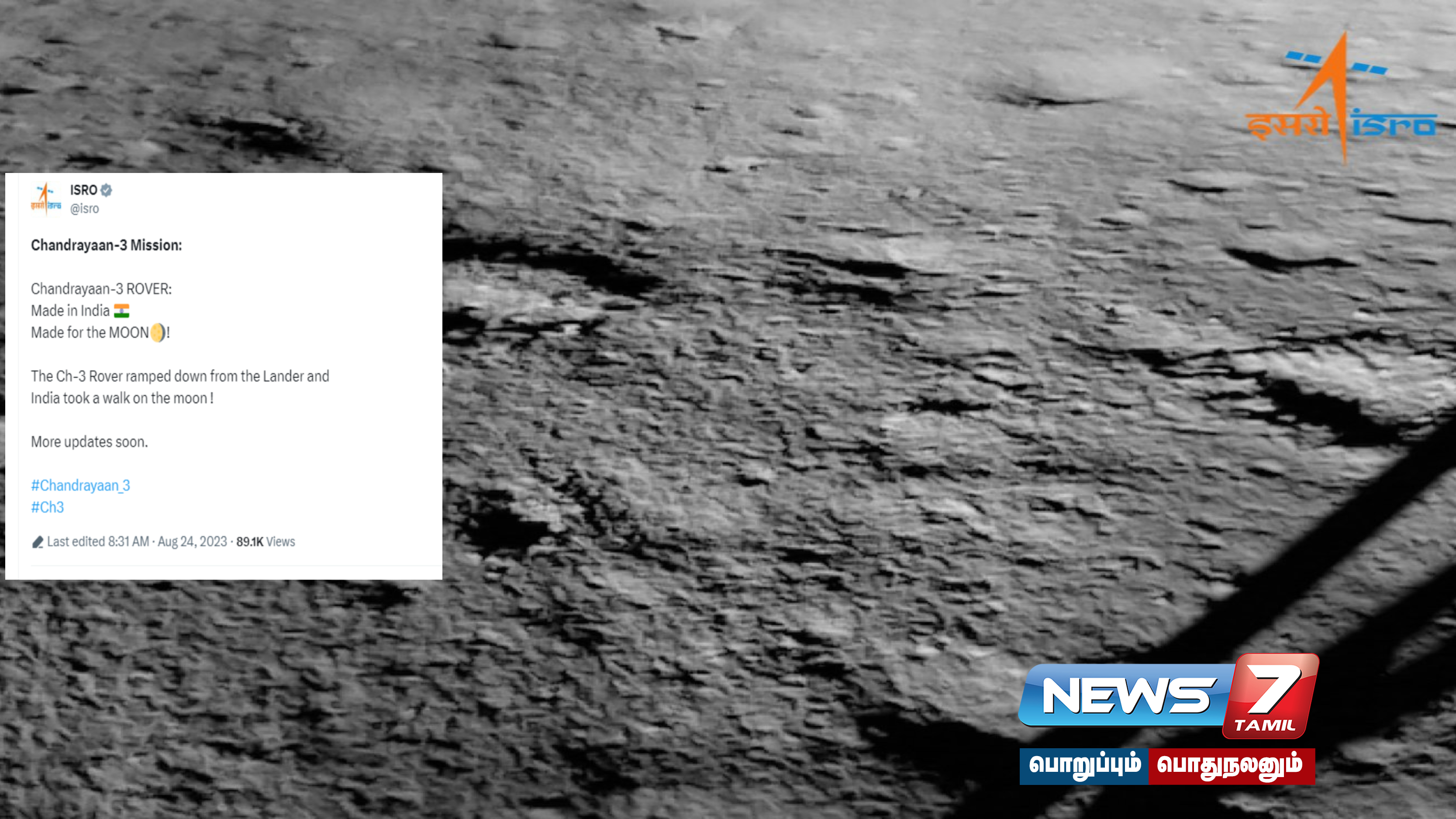 இந்நிலையில் இஸ்ரோ தனது ட்விட்டர் பக்கத்தில் பதிவு ஒன்றை வெளியிட்டுள்ளது. அந்த பதிவில், “இந்தியாவில் தயாரிக்கப்பட்டது. நிலவுக்காக தயாரிக்கப்பட்டது. விக்ரம் லேண்டரில் இருந்து வெளியே வந்த பிரக்யான் ரோவர் நகர்ந்து சென்றது. நிலவில் நடந்து சென்ற இந்தியா. விரைவில் புதுப்பிக்கப்பட்ட தகவல்கள் வெளியாகும்” என பதிவிடப்பட்டுள்ளது.