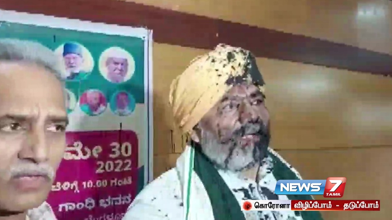 இந்நிலையில், இதற்கு விளக்கம் அளிப்பதற்காக பெங்களூருவில் நடைபெற்ற செய்தியாளர் சந்திப்பில் இவர் கலந்து கொண்டார். அப்போது, ஒரு சிலர் அவர் முகத்தின் மீது கருப்பு மை வீசினர். இதனால், அங்கிருந்த இரு தரப்பினரக்கு இடையே மோதல் ஏற்பட்டு, பிளாஸ்டிக் நாற்காலிகளை ஒருவர் மீது ஒருவர் வீசிக் கொண்டனர். இதையடுத்து மூன்று பேரை பிடித்து போலீசார் விசாரணை மேற்கொண்டு வருகின்றனர்.