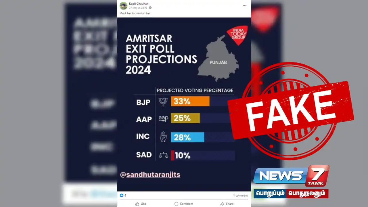 அமிர்தசரஸ் மக்களவைத் தொகுதிக்கான இந்தியா டுடேயின் எக்ஸிட் போல் கணிப்புகளைக் காட்டும் கிராஃபிக் புகைப்படம் கற்பனையானது. அந்த கிராபிக்ஸ் நம்பகத்தன்மையற்றது என்றும் அந்த செய்தி சேனல் தெளிவுபடுத்தியுள்ளது. எனவே, இந்தக் கூற்று போலியானது எனக் கண்டறியப்பட்டுள்ளது.