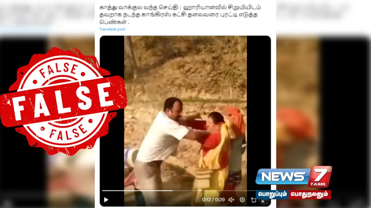ஹரியானாவில் சிறுமியிடம் காங்கிரஸ் கட்சி தலைவர் அத்துமீறியதாகவும், அதனால் அவர் அங்குள்ள பெண்களால் தாக்கப்பட்டதாகவும் சமூக வலைதளங்களில் வைரலாகி வரும் வீடியோ உண்மை இல்லை என கண்டறியப்பட்டுள்ளது.