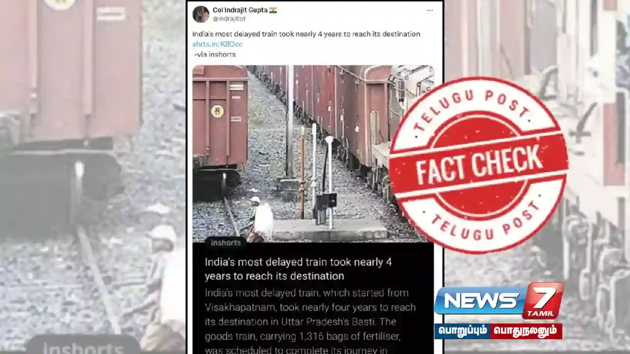 சமீபத்தில், பல செய்தி இணையதளங்கள் மற்றும் சமூக ஊடக பதிவுகள் இந்தியாவில் ஒரு சரக்கு ரயில் அதன் இலக்கை அடைய மூன்று ஆண்டுகளுக்கும் மேலாக எடுத்துக் கொள்வதாக செய்தியை பகிர்ந்தது. சில செய்தி அறிக்கைகள் தாமதத்தின் நீளத்தை 42 மணிநேரத்திற்குப் பதிலாக 3 ஆண்டுகள், 8 மாதங்கள் மற்றும் 7 நாட்கள் எனக் குறிப்பிடுகின்றன. இந்த சரக்கு ரயில் விசாகப்பட்டினத்தில் இருந்து புறப்பட்டு உத்தரபிரதேசத்தில் இலக்கை அடைய கிட்டத்தட்ட 4 ஆண்டுகள் ஆனதாக செய்திகள் தெரிவிக்கின்றன. வைரலான பதிவுகளின்படி, 1316 உர மூட்டைகளை ஏற்றிச் சென்ற சரக்கு ரயில் சுமார் 42 மணி நேரத்தில் தனது பயணத்தை முடிக்க வேண்டும், அதன் பிறகு அதிகாரிகள் அதைக் காணவில்லை என்று கண்டறிந்தனர் என தெரிவிக்கப்பட்டிருந்தது.