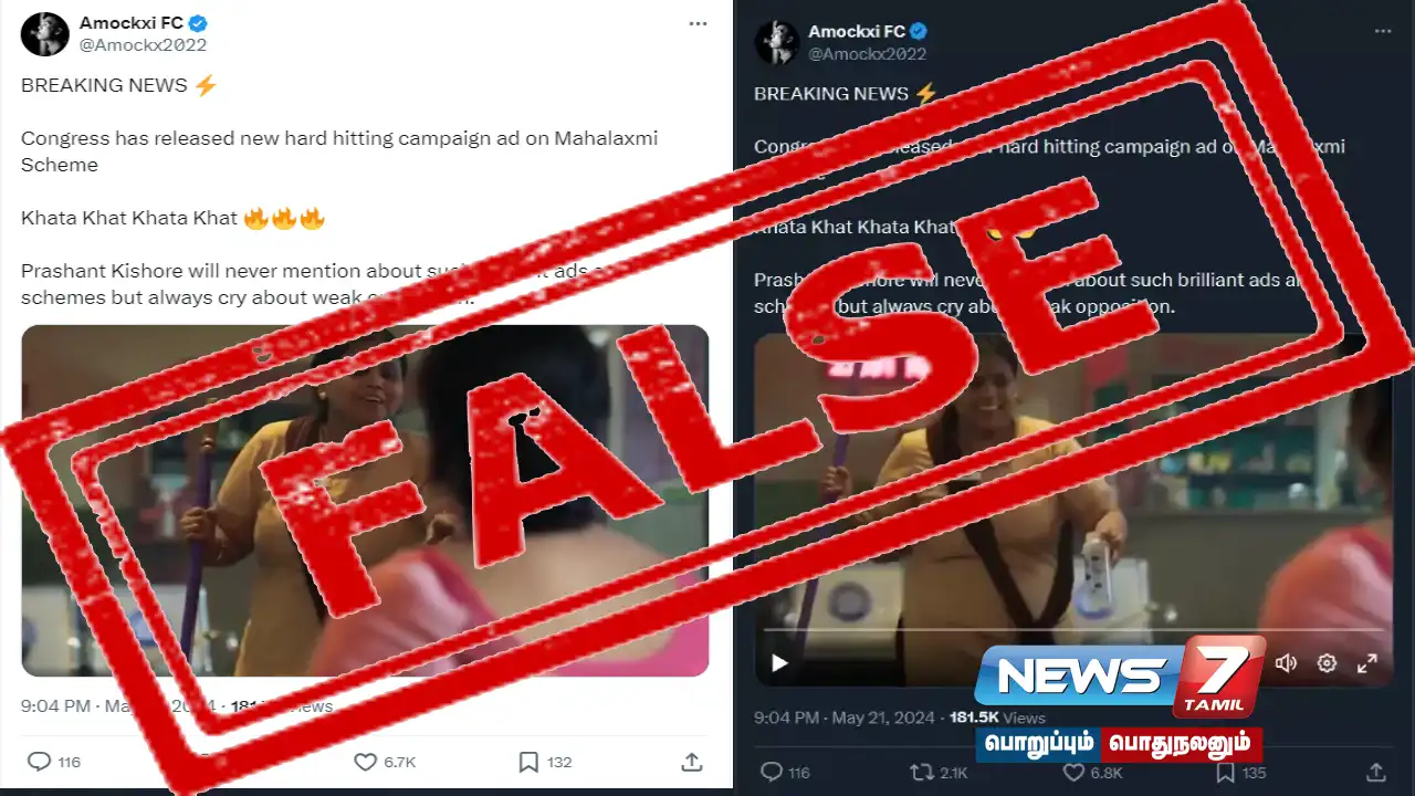 வைரலான முழு வீடியோவின் ஒரு பகுதியான 1.14 நிமிடத்தில் இருந்து வீடியோவை மட்டும் Amockxi FC (@Amockx2022) என்ற ட்விட்டர் (எக்ஸ்) கணக்கில் பகிர்ந்து, “BREAKING NEWS: மகாலக்ஷ்மி திட்டத்தில் காங்கிரஸ் புதிய கடினமான பிரசார விளம்பரத்தை வெளியிட்டுள்ளது. பிரசாந்த் கிஷோர் இதுபோன்ற அற்புதமான விளம்பரங்கள் மற்றும் திட்டங்களைப் பற்றி ஒருபோதும் குறிப்பிட மாட்டார். ஆனால் பலவீனமான எதிர்ப்பைப் குறித்து பேசி அழுவார்” என தலைப்பிடப்பட்டுள்ளது.